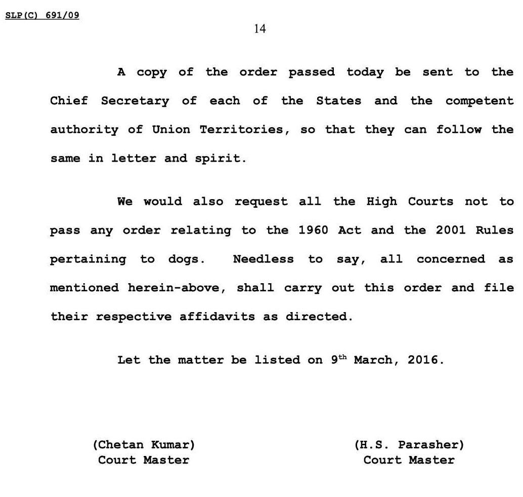 மேலும், அனைத்து உயர் நீதிமன்றங்களும் பிராணிகள் நல பாதுகாப்பு தொடர்பான விதிகள் குறித்து எவ்வித உத்தரவும் வழங்க வேண்டாம் எனவும், தங்கள் உத்தரவில் தெரிவித்துள்ளனர்.