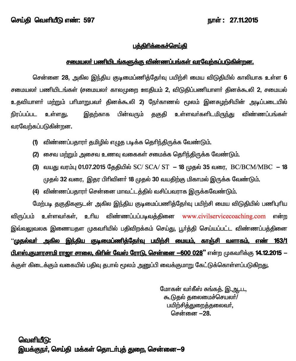 Home|News|அகில இந்திய குடிமைப்ணித்தேர்வு பயிற்சி மைய விடுதியில் சமையலர் பணியிடங்களுக்கு விண்ணப்பங்கள் வரவேற்கப்படுகின்றன! -கே.பி.சுகுமார்.