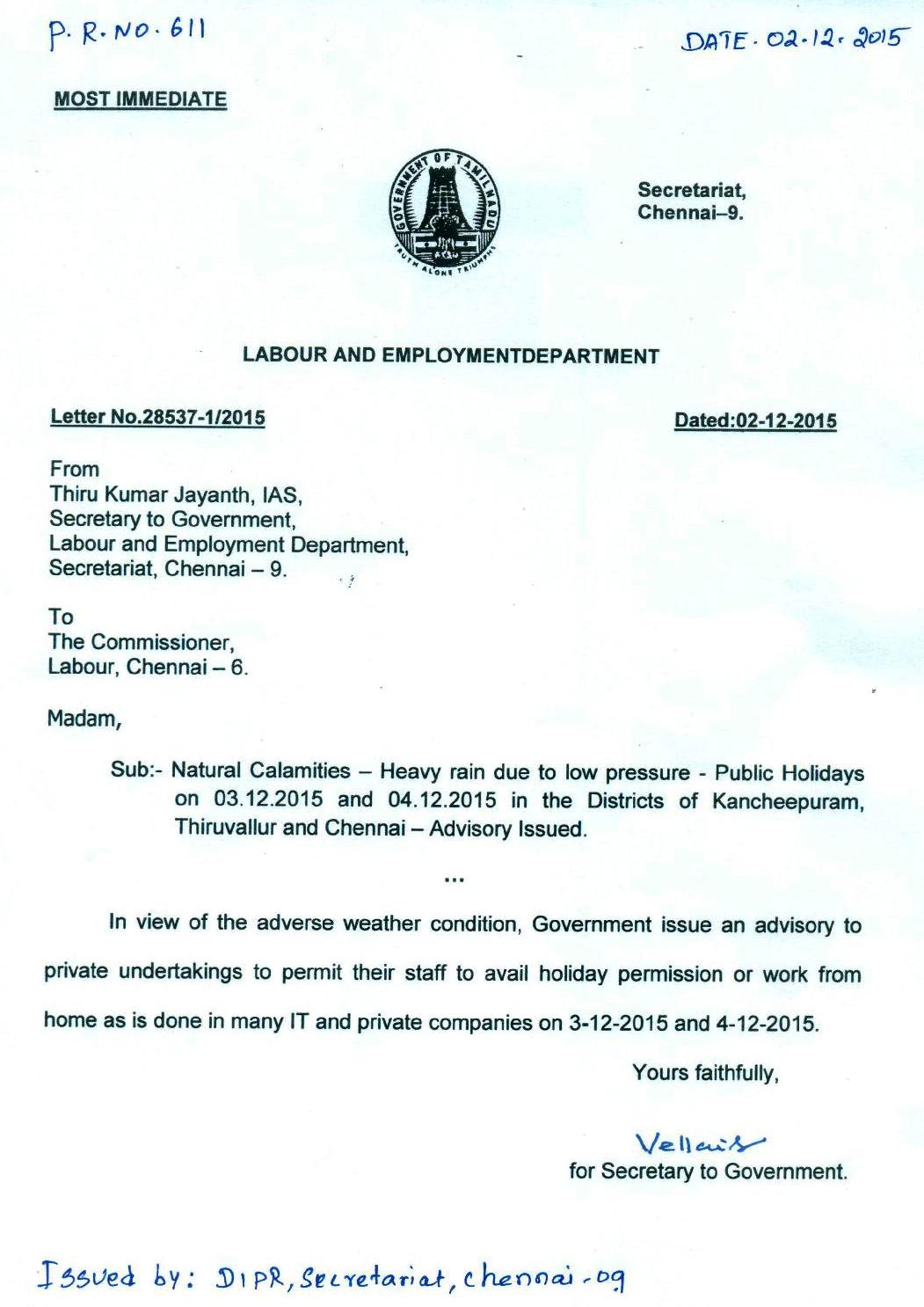 இதுகுறித்து தமிழக அரசின் தொழிலாளர் நலத்துறை விடுத்துள்ள செய்திக்குறிப்பில், தற்போது ஏற்பட்டுள்ள வெள்ளத்தை கருத்தில் கொண்டு 3-ம் தேதி மற்றும் 4-ம் தேதி ஆகிய இரு நாட்கள் விடுமுறை அளிக்குமாறு கேட்டுக்கொள்கிறோம்” எனக் கூறப்பட்டுள்ளது.