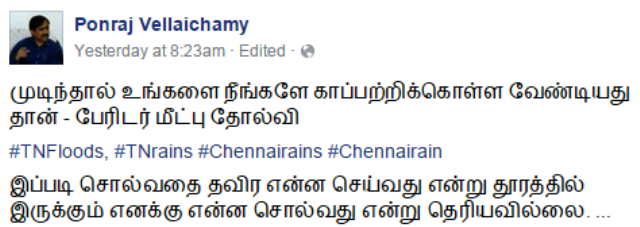 தமிழகத்திற்கு அப்பால் தலைமறைவாக இருந்து கொண்டு, சென்னை மீட்பு பணிகளில் பேரிடர் மேலாண்மை தோல்வி அடைந்து விட்டதாக சொல்வதற்கு  இவருக்கு என்ன தகுதி இருக்கிறது?