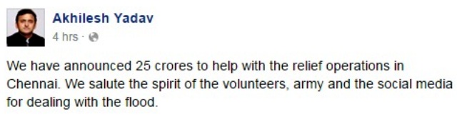 தமிழக வெள்ள நிவாரணப் பணிகளுக்காக முதலமைச்சரின் நிவாரண நிதிக்கு ரூ.25 கோடி வழங்கப்படும் என உத்தர பிரதேச முதலமைச்சர் அகிலேஷ் யாதவ் இன்று (07.12.2015) அறிவித்துள்ளார்.