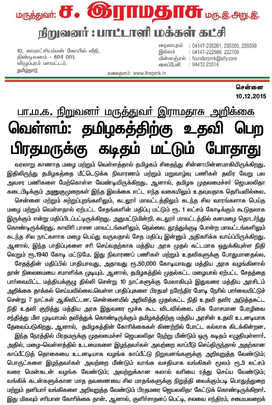 மழை மற்றும் வெள்ளதால் ஏற்பட்ட சேதங்களின் மதிப்பு ரூ. 1 லட்சம் கோடிக்கும் கூடுதலாக இருக்கும்! ரூ.50,000 கோடியாவது மத்திய அரசு வழங்கினால் தான் நிலைமையை சமாளிக்க முடியும்! -மத்திய அரசுக்கு அரசியல் ரீதியில் அழுத்தம் கொடுத்தால் மட்டுமே இது சாத்தியமாகும்: மருத்துவர் இராமதாஸ் யோசனை!