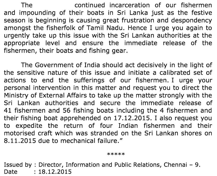 தாங்கள் இந்த பிரச்சினையில் தனிப்பட்ட முறையில் தலையிட்டு, வெளியுறவு அமைச்சகத்துக்கு உத்தரவிட்டு, 17–12–2015 அன்று பிடித்து செல்லப்பட்ட 4 மீனவர்கள் உள்பட தமிழக மீனவர்கள் 41 பேரையும் அவர்களது 56 படகுகளையும் விடுவிக்க இலங்கை அரசிடம் பேசி தேவையான நடவடிக்கை எடுக்க வேண்டும் என்று கேட்டுக் கொள்கிறேன்.