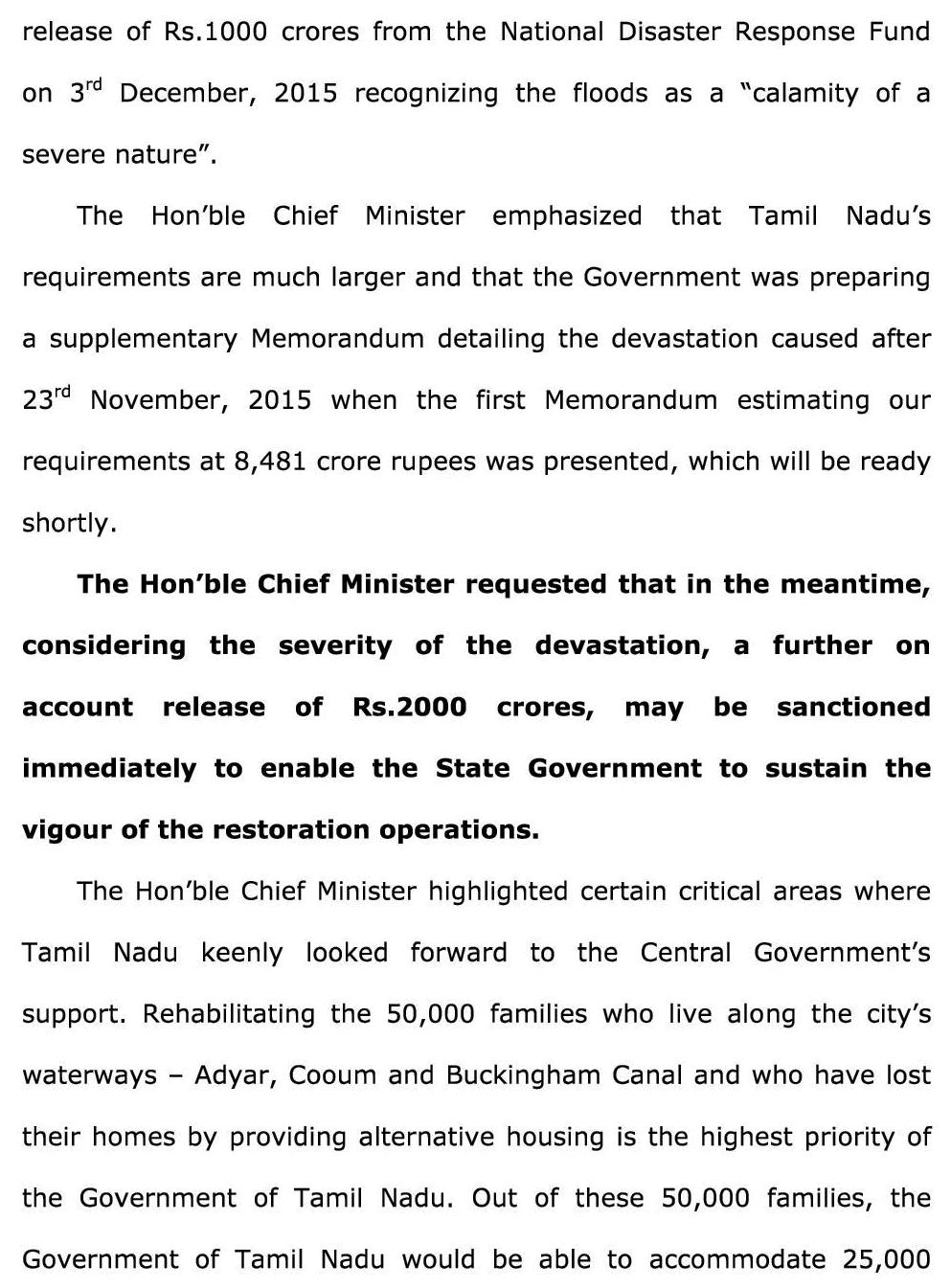 இந்த நேரத்தில் தமிழ் நாட்டுக்கு ரூ.1000 கோடி நிதியை உடனடியாக ஒதுக்கிய பிரதமருக்கும், நிதி அமைச்சருக்கும் முதலமைச்சர் ஜெ.ஜெயலலிதா நன்றி தெரிவித்து கொண்டார். மழை வெள்ள பாதிப்பு குறித்து மத்திய அரசிடம் தமிழகம் சார்பில் நவம்பர் 23–ந்தேதி கொடுக்கப்பட்ட அறிக்கையில் ரூ.8481 கோடி கேட்கப்பட்டிருந்தது.