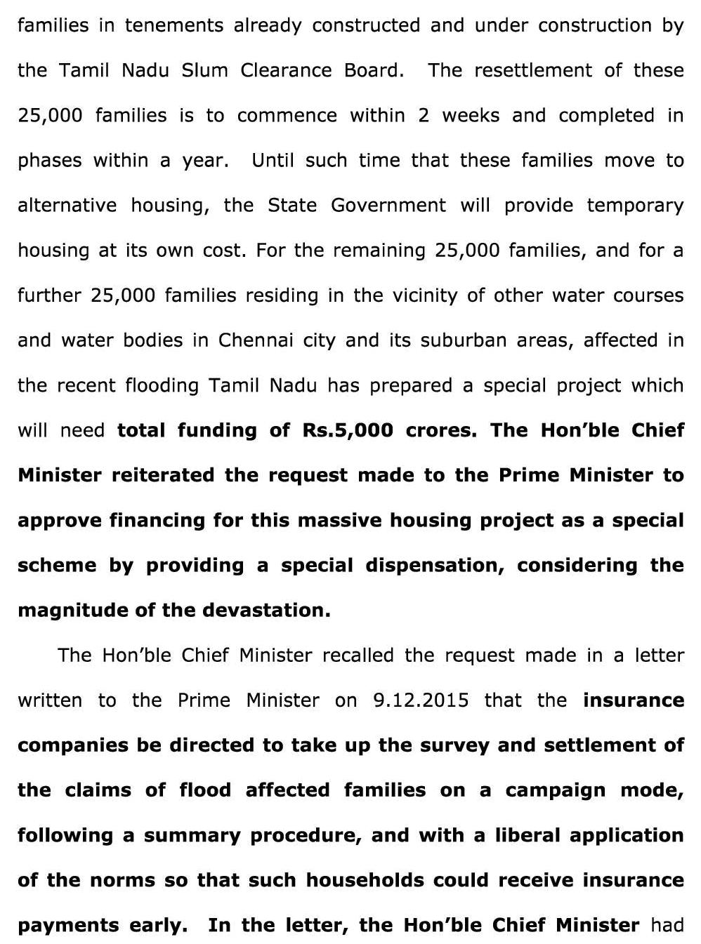 இந்த சிறப்புத் திட்டத்துக்கு ரூ.5 ஆயிரம் கோடி நிதி தேவை. மாபெரும் இந்த வீட்டு வசதி சிறப்புத் திட்டத்துக்கு பிரதமர் உதவ வேண்டும் என்று முதலமைச்சர் ஜெ.ஜெயலலிதா கேட்டுக் கொண்டார்.