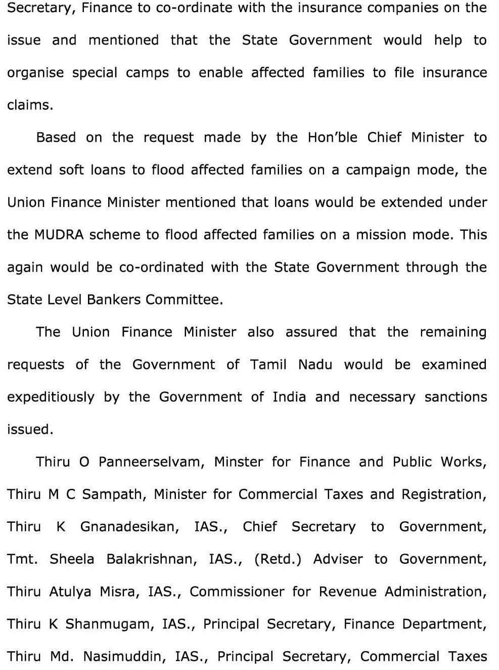 முதலமைச்சர் ஜெ.ஜெயலலிதா மத்திய நிதி அமைச்சர் அருண்ஜெட்லியிடம் கேட்டுக் கொண்டதற்கு இணங்க, மழை வெள்ளத்தால் பாதிக்கப்பட்ட மக்களுக்கு முத்ரா திட்டத்தின் கீழ் உதவிகள் வழங்கப்படும் என்று மத்திய அமைச்சர் அறிவித்துள்ளார்.