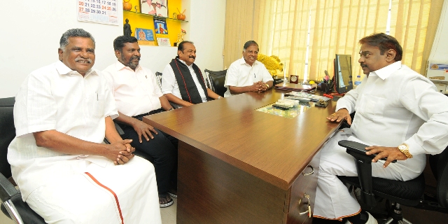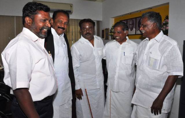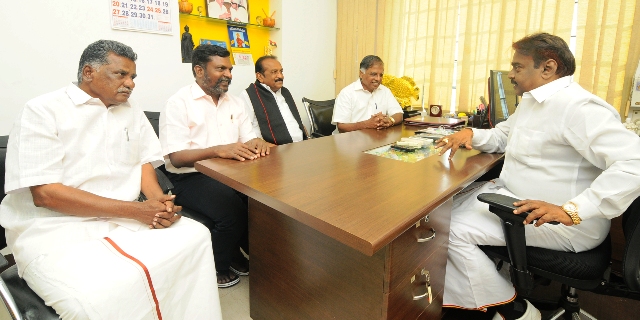 தே.மு.தி.க. தலைவர் நடிகர் விஜயகாந்த்தை, சென்னை கோயம்பேட்டிலுள்ள தே.மு.தி.க தலைமை அலுவலகத்தில் இன்று (23.12.2015) காலை 11 மணியளவில் மக்கள் நல கூட்டு இயக்கத்தின் ஒருங்கிணைப்பாளரும், ம.தி.மு.க பொதுச் செயலாளருமான வைகோ தலைமையில், சிபிஐ (எம்) மாநிலச்செயலாளர் ஜி.இராமகிருஷ்ணன், இந்திய கம்யூனிஸ்ட் கட்சியின் மாநிலச்செயலாளர் முத்தரசன், விடுதலைச் சிறுத்தைகள் கட்சித் தலைவர் தொல்.திருமாவளவன் ஆகியோர் சந்தித்தனர்.
