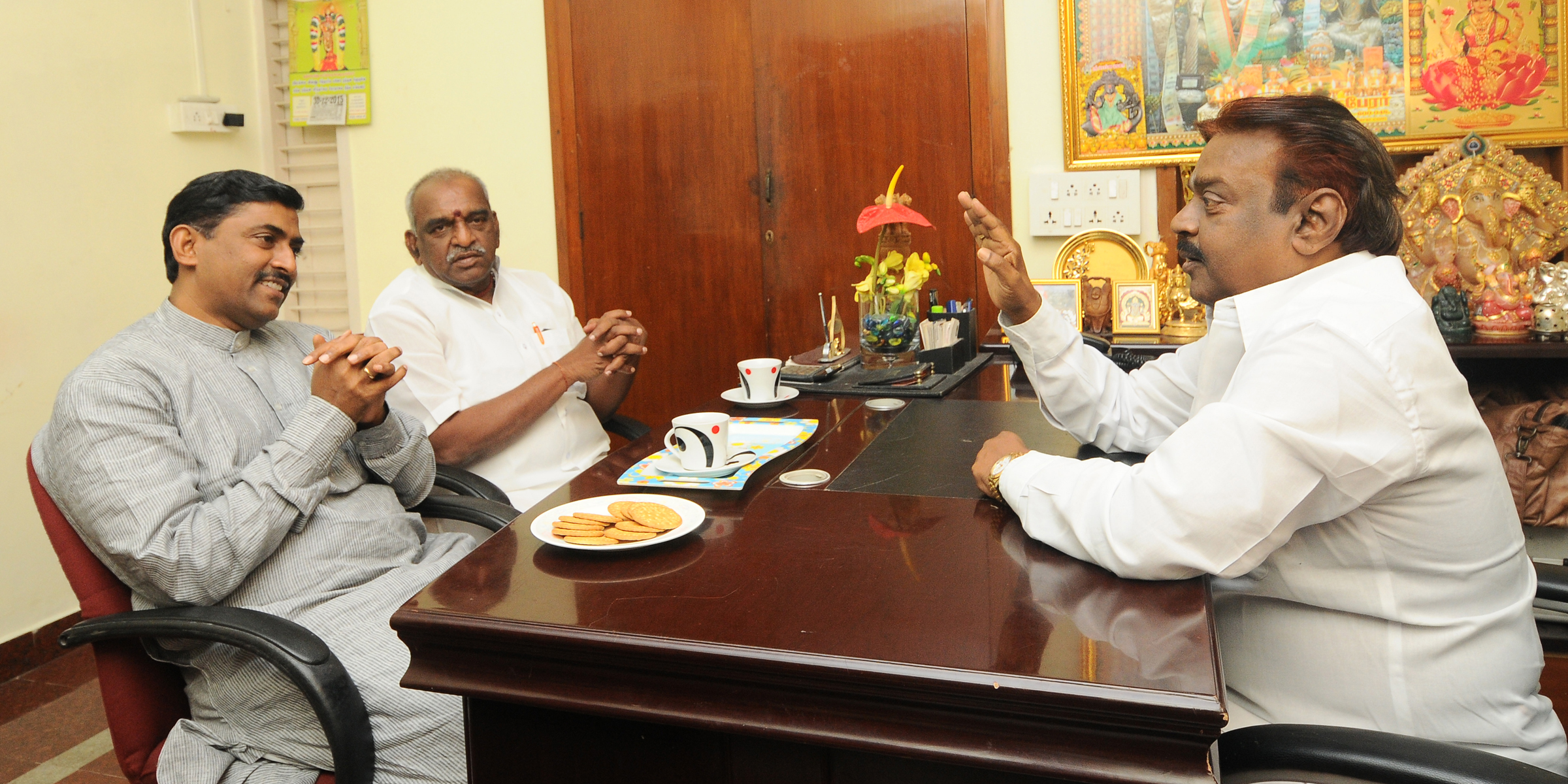 தே.மு.தி.க. தலைவர் நடிகர் விஜயகாந்த்தை, சென்னை சாலிகிராமத்திலுள்ள அவரது இல்லத்தில் இன்று (30.12.2015) மாலை 3 மணியளவில் பாரதிய ஜனதா கட்சியின் தேசிய பொதுச்செயலாளர் முரளிதரராவ், மத்திய அமைச்சர் பொன்.இராதாகிருஷ்ணன் ஆகியோர் சந்தித்தனர்.