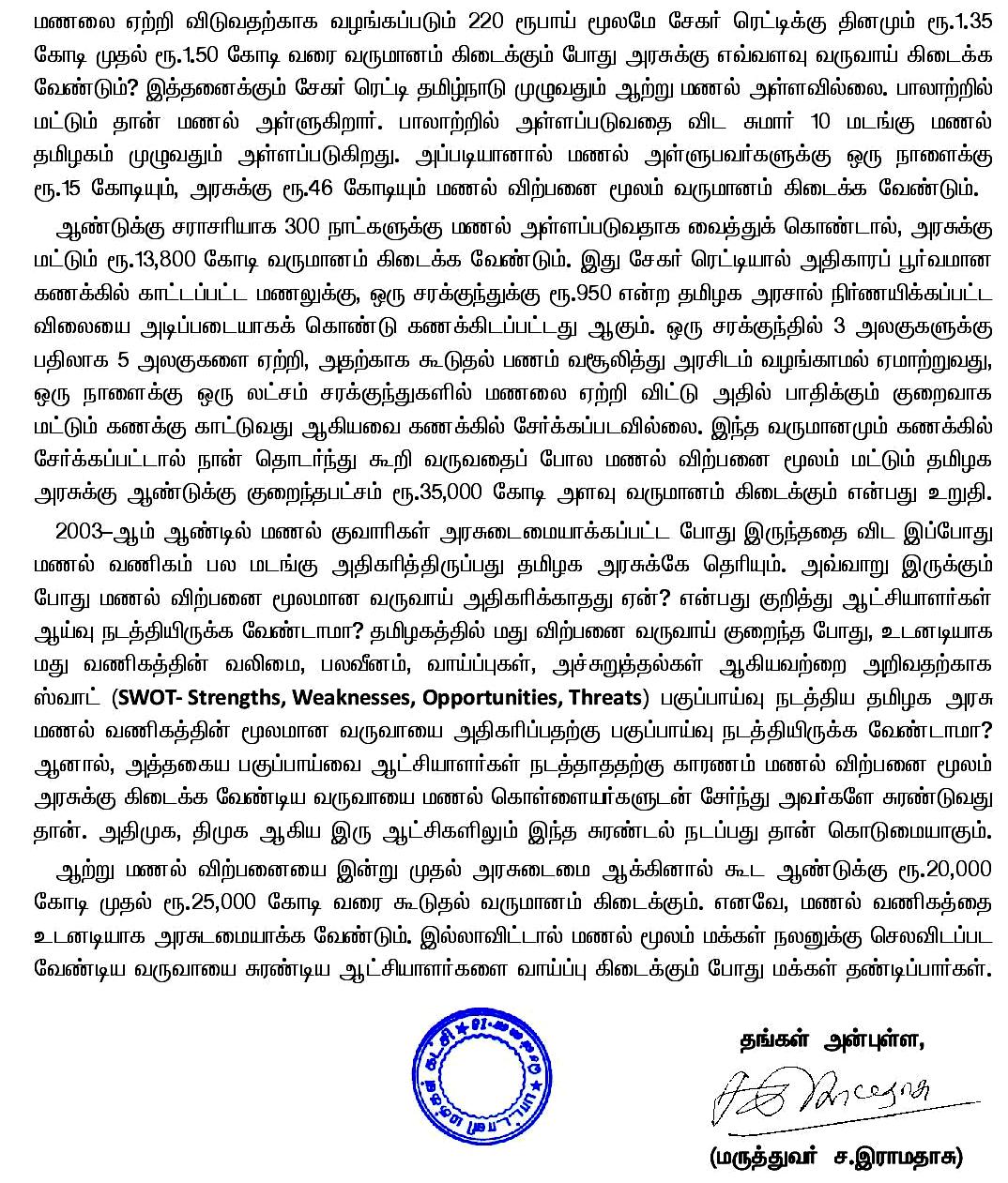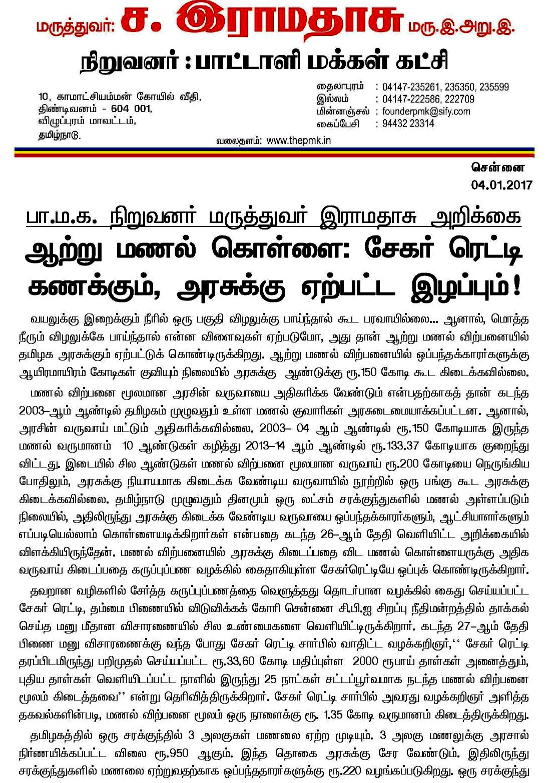 தமிழகத்தில் மது விற்பனை வருவாய் குறைந்த போது, உடனடியாக பகுப்பாய்வு நடத்திய தமிழக அரசு, மணல் வணிகத்தின் மூலமான வருவாயை அதிகரிப்பதற்கு பகுப்பாய்வு நடத்தியிருக்க வேண்டாமா?- பா.ம.க. நிறுவனர் மருத்துவர் ச.ராமதாஸ் கேள்வி.