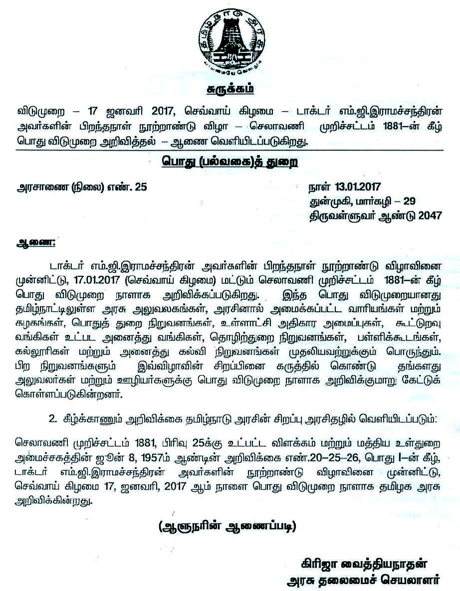 எம்.ஜி.ஆர். பிறந்த நாள் நூற்றாண்டு விழாவை முன்னிட்டு ஜனவரி-17 பொது விடுமுறை: ஆளுநரின் ஆணைப்படி, தமிழக தலைமைச் செயலாளர் கிரிஜா வைத்தியநாதன் அறிவிப்பு.