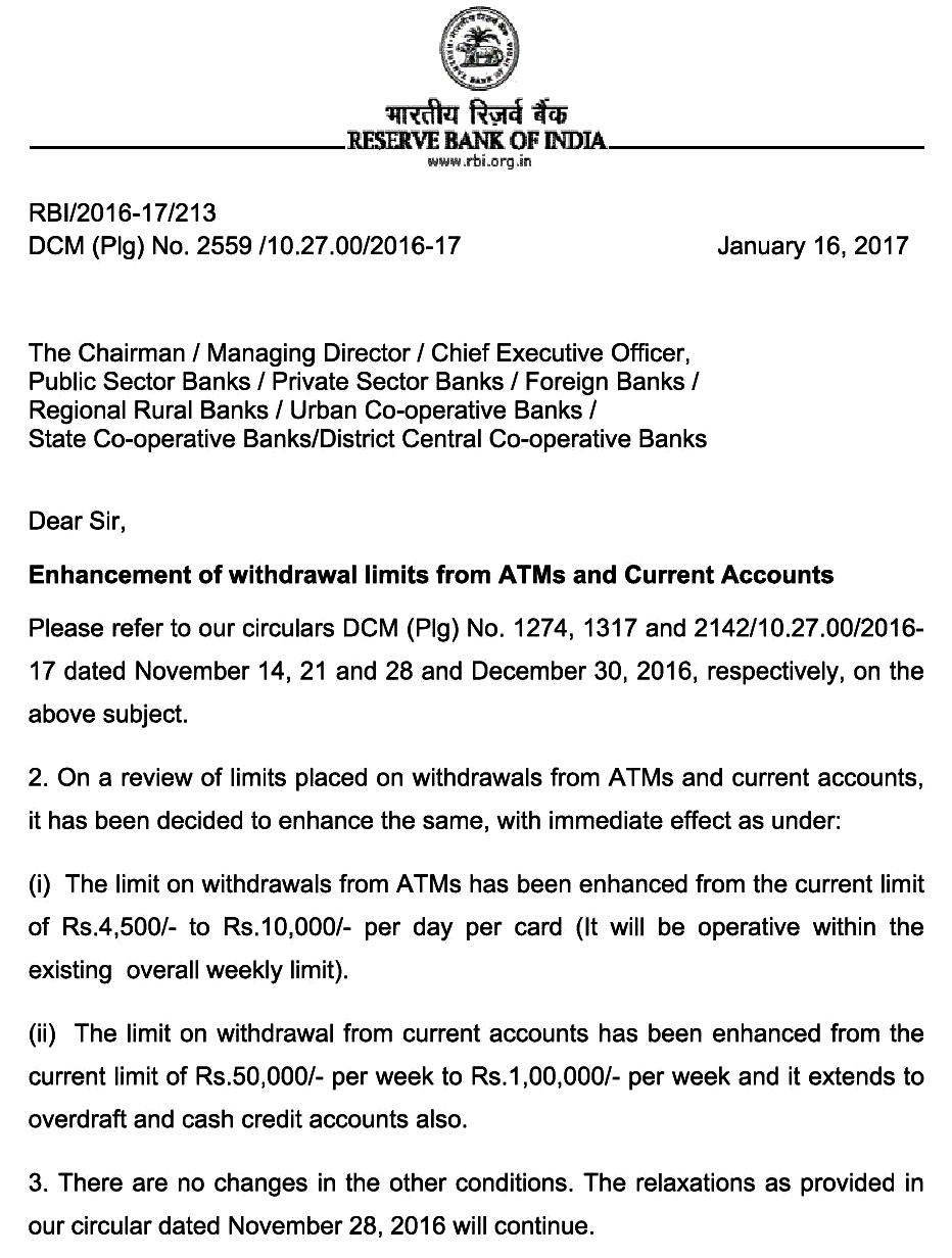 பணம் எடுப்பதற்கான உச்ச வரம்பு மேலும் அதிகரிக்கப்பட்டுள்ளது. இனி தினமும் நாள் ஒன்றுக்கு 10 ஆயிரம் ரூபாய் வரை .டி.எம்.களில் பணம் எடுக்கலாம் என ரிசர்வ் வங்கி இன்று அறிவித்துள்ளது