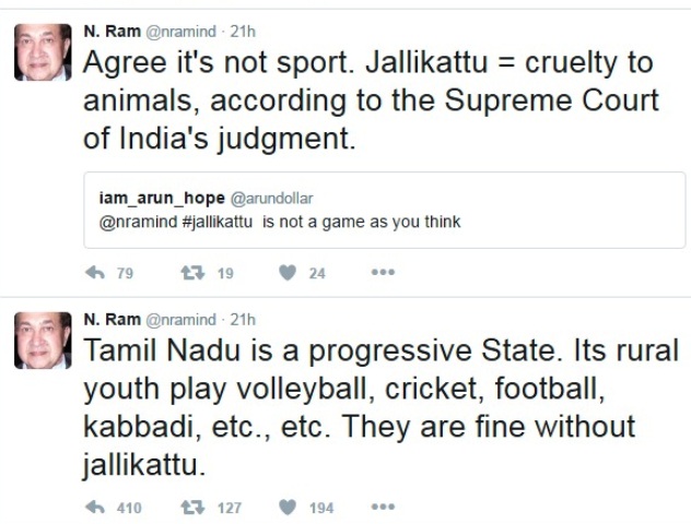 இந்நிலையில், ஹிந்து பத்திரிக்கை முதன்மை ஆசிரியர் என்.ராம், தமிழகம் ஒரு முற்போக்கான மாநிலம். இங்குள்ள கிராமப்புற இளைஞர்கள் கைப்பந்து, கிரிக்கெட், கால்பந்து, கபடி உள்ளிட்ட எண்ணற்ற விளையாட்டுக்களை விளையாடி வருகின்றனர். ஜல்லிக்கட்டு இல்லையென்றாலும் அவர்கள் நன்றாகவே இருப்பார்கள் என்று கூறியுள்ளார்.