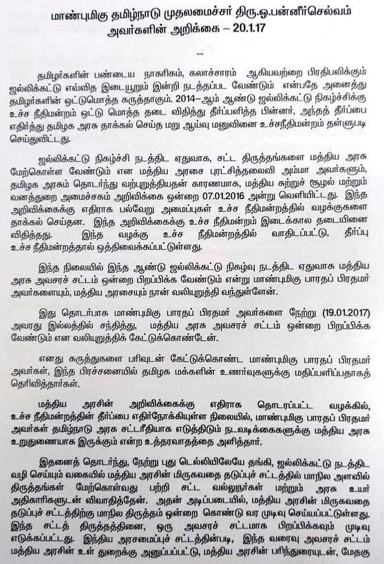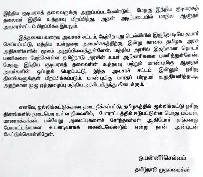 Home|News|அவசரச் சட்டம் ஓரிரு நாளில் பிறப்பிக்கப்படும்; தமிழகத்தில் ஓரிரு நாளில் ஜல்லிக்கட்டு நடத்தப்படும்: முதல்வர் பன்னீர்செல்வம் அறிக்கை! -முழு விபரம். -எம்.ரமேஷ் குப்தா.