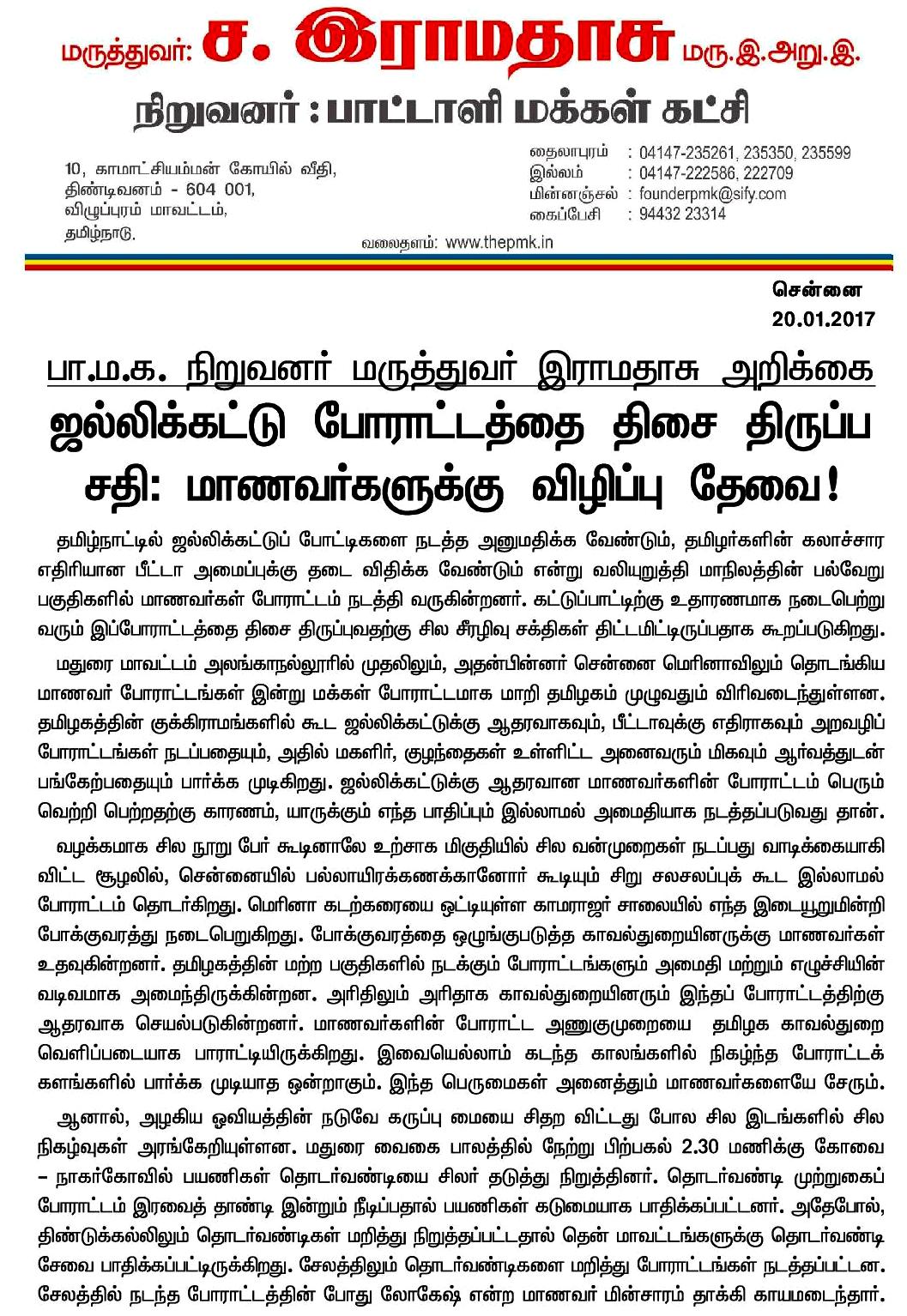 Home|News|ஜல்லிக்கட்டு போராட்டத்தை திசை திருப்ப சதி; மாணவர்கள் விழிப்போடு இருக்க வேண்டும்: பா.ம.க. நிறுவனர் மருத்துவர் ச.இராமதாஸ் அறிக்கை. -டாக்டர் துரைபெஞ்சமின். ullatchithagaval@gmail.com