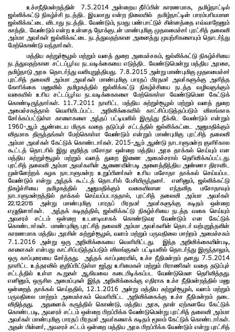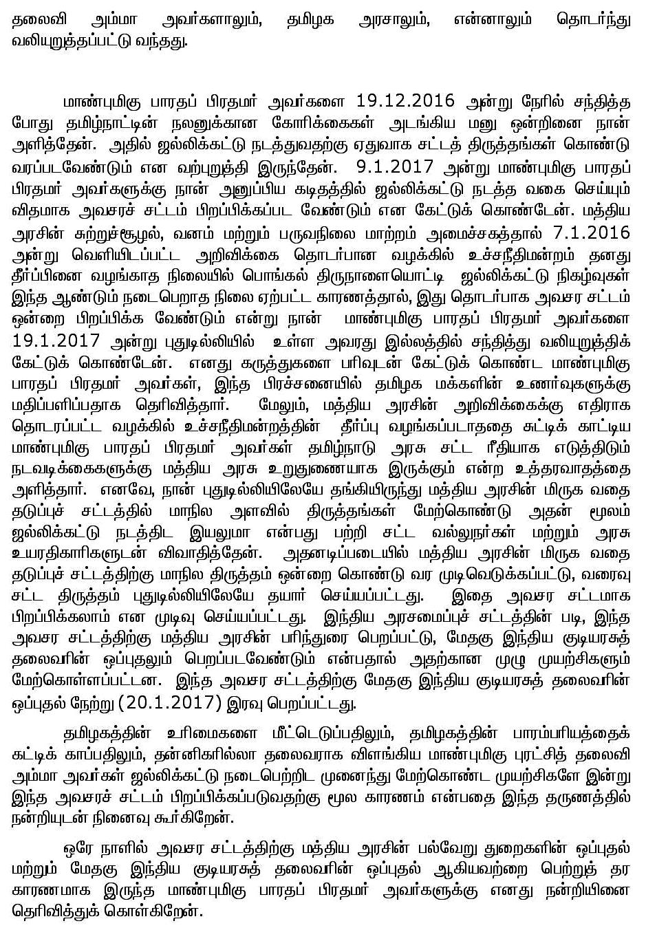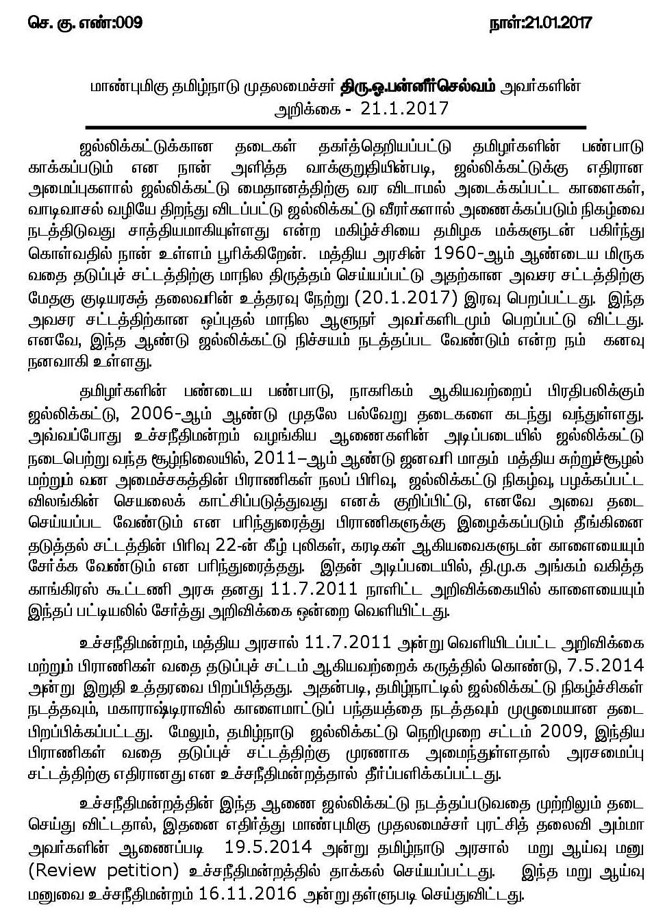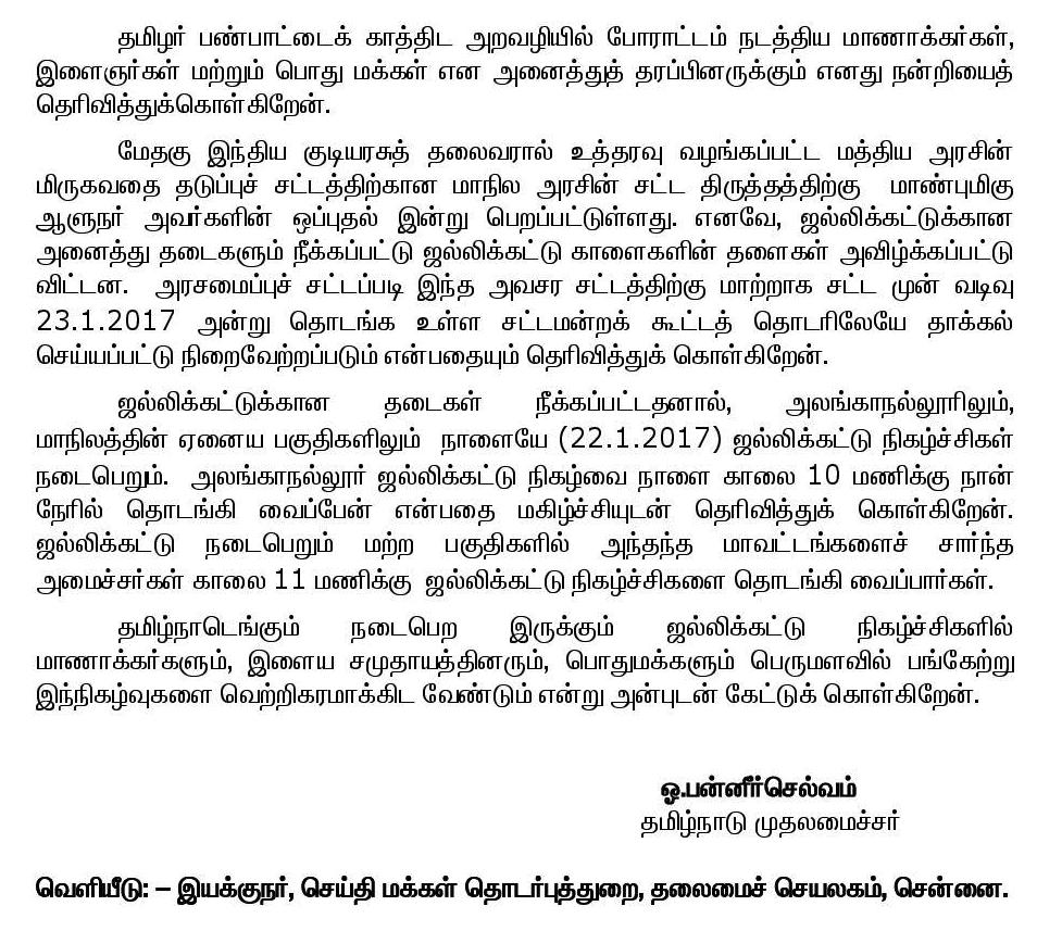 ஜல்லிக்கட்டுக்கான தடைகள் நீக்கப்பட்டதால் நாளையே ஜல்லிக்கட்டு நிகழ்ச்சிகள் நடைபெறும்; போராட்டம் நடத்திய மாணவர்கள், இளைஞர்கள் மற்றும் பொதுமக்களுக்கு நன்றி: முதலமைச்சர் ஓ.பன்னீர் செல்வம் அறிக்கை.