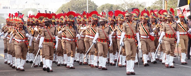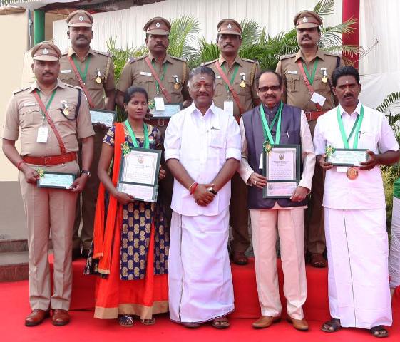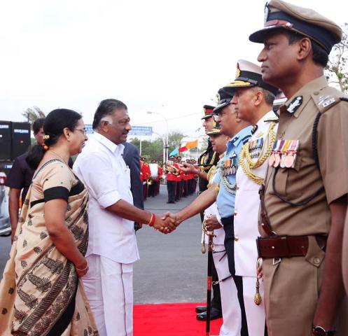 தொடர்ந்து, முப்படை சார்பில் குடியரசு நாள் அணிவகுப்பு நிகழ்ச்சி நடைபெற்றது. அணிவகுப்பு மேடையில் இருந்தபடி அணி வகுப்பு மரியாதையை முதல்வர் ஓ.பன்னீர்செல்வம் ஏற்றார். பின்னர் வீர தீர செயல்களில் ஈடுபட்டவர்களுக்கு பல்வேறு விருதுகளை அவர் வழங்கினார்.