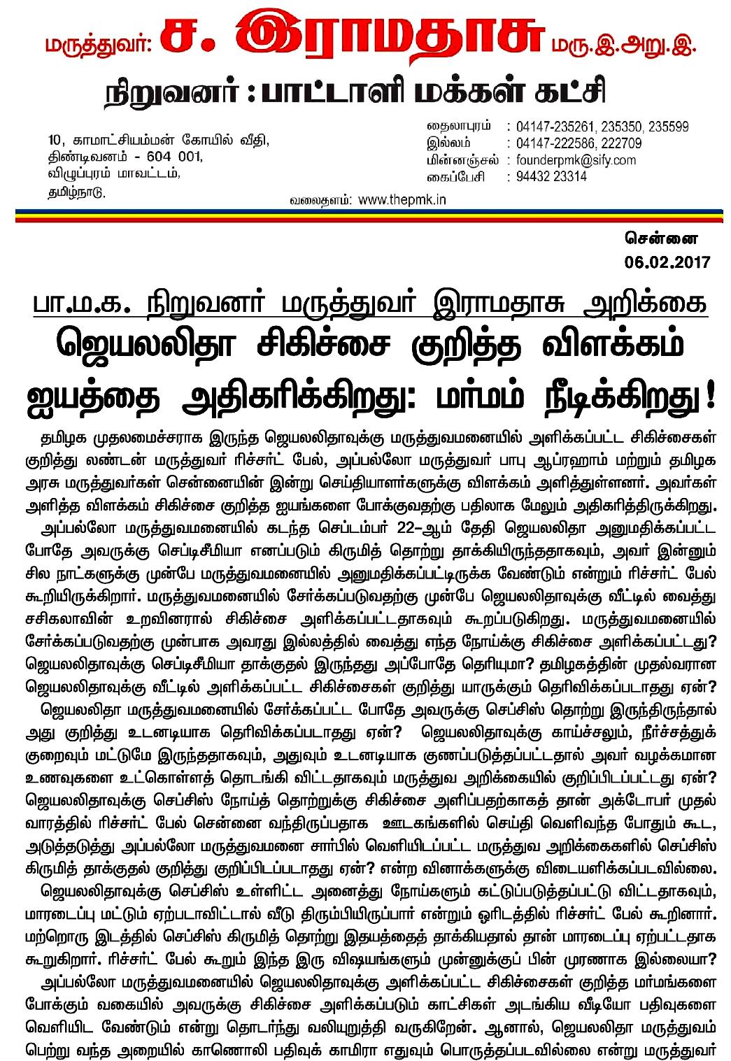 ஜெயலலிதா மரணம் குறித்து மத்திய புலனாய்வுப் பிரிவு, மருத்துவ வல்லுனர்கள், நீதிபதிகள் அடங்கிய பல்துறை விசாரணைக்குழுவை (Multi Disciplinary Investigation Team)அமைத்து விசாரணை நடத்த ஆணையிட வேண்டும்: பா.ம.க. நிறுவனர் மருத்துவர் ச.ராமதாஸ் அறிக்கை.