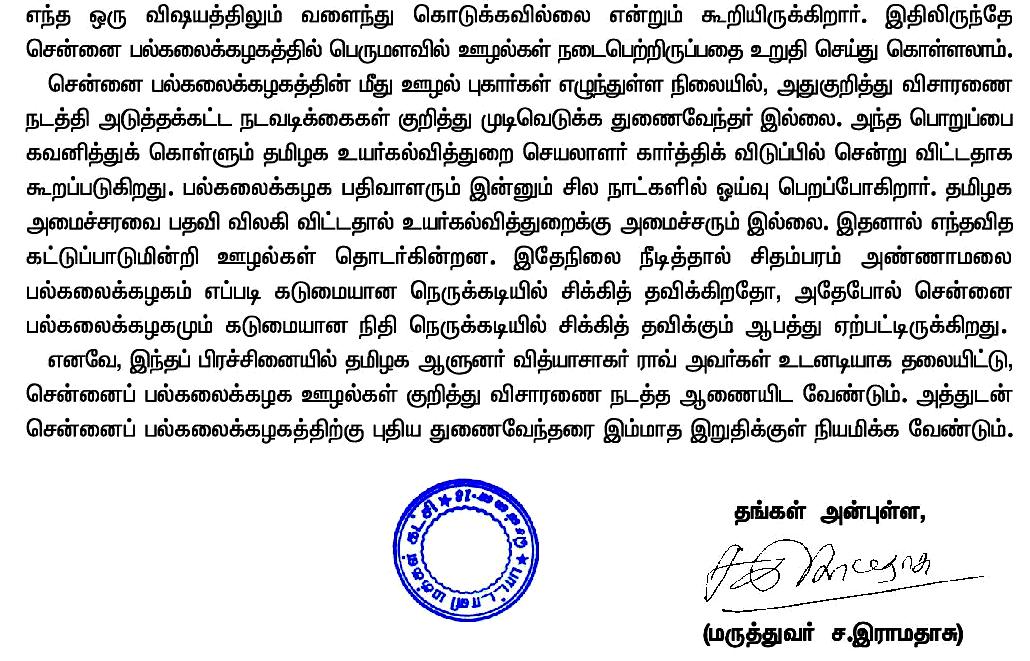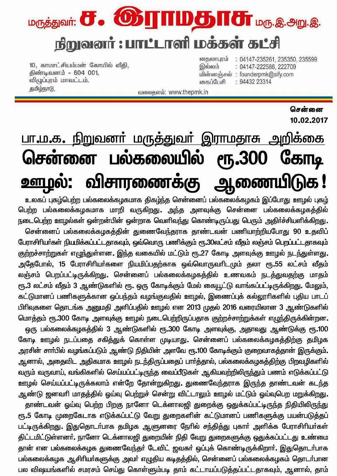 Home|News|சென்னை பல்கலைக்கழகத்தில் 300 கோடி ஊழல்; விசாரணை நடத்த ஆணையிட வேண்டும்: பா.ம.க. நிறுவனர் மருத்துவர் ச.ராமதாஸ் அறிக்கை. -டாக்டர் துரைபெஞ்சமின். ullatchithagaval@gmail.com