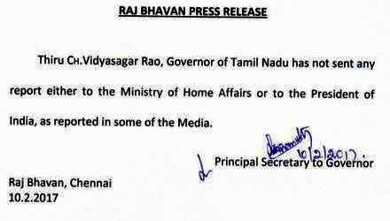 மத்திய உள்துறை அமைச்சகத்துக்கோ அல்லது குடியரசு தலைவருக்கோ அறிக்கை எதுவும் அனுப்பவில்லை என, தமிழக ஆளுநரின் முதன்மை செயலர் மறுப்பு  தெரிவித்துள்ளார்.