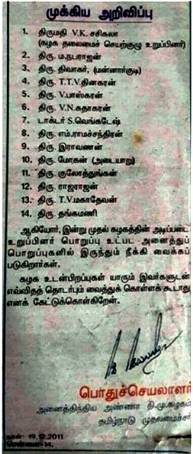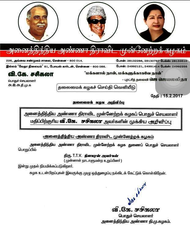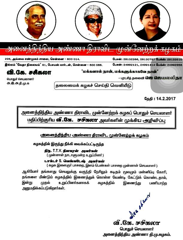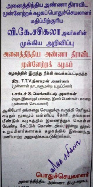 அன்று ஜெ.ஜெயலலிதாவால் நீக்கப்பட்டவர்கள்; இன்று அதிமுகவில் சேர்க்கப்பட்டனர்!-சசிகலாவின் அக்கா மகன் டி.டி.வி தினகரன் அ.தி.மு.க-வின் துணை பொதுச் செயலாளராக நியமனம்!- தொடரும் சர்ச்சை.