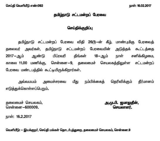 பெரும்பான்மையை நிருபிக்க தமிழக சட்டசபை பிப்ரவரி 18-ம் தேதி கூடுகிறது!