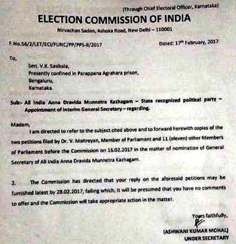 இந்நிலையில், புகாரை ஏற்றுகொண்ட இந்திய தேர்தல் ஆணையம், இதுகுறித்து 28.02.2017-க்குள் விளக்கம் அளிக்க வேண்டும் என சசிகலாவுக்கு நோட்டீஸ் அனுப்பி உள்ளது. சசிகலா சிறையில் இருப்பதால், அந்த நோட்டீஸ் பெங்களூரு பரப்பன அக்ரஹாரா சிறைக்கு அனுப்பப்பட்டுள்ளது.