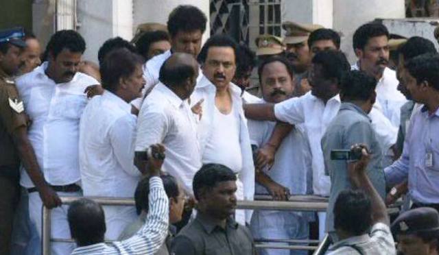 சட்டப்பேரவையின் மாண்புகளை சீர்குலைத்ததால், திமுக உறுப்பினர்களை அவையிலிருந்து வெளியேற்ற சபாநாயகர் தனபால் உத்தரவிட்டார். இதையடுத்து திமுக உறுப்பினர்களுக்கும், அவைக் காவலர்களுக்கும் தள்ளு முள்ளு ஏற்பட்டது. திமுக உறுப்பினர்களை அவைக் காவலர்கள் வலுக்கட்டாயமாக அவையிலிருந்து வெளியேற்றினர். எதிர் கட்சி தலைவர் மு.க.ஸ்டாலின் அவைக் காவலர்களால் குண்டுக்கட்டாக தூக்கிவரப்பட்டார். இதை தொடர்ந்து காங்கிரஸ் எம்.எல்.ஏக்கள் அனைவரும் அவையிலிருந்து வெளிநடப்பு செய்தனர்.