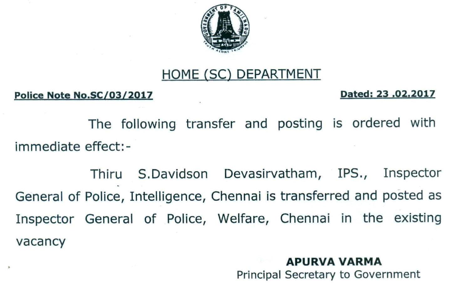 தமிழக உளவுத் துறை ஐ.ஜி.ஆக இருந்த டேவிட்சன் தேவாசிர்வாதம் பணியிட மாற்றம் செய்யப்பட்டுள்ளார். அவர் சென்னை காவல்துறை நல்வாழ்வு ஐ.ஜி.யாக மாற்றப்பட்டுள்ளார். இந்த பணியிட மாற்ற உத்தரவு உடனடியாக நடைமுறைக்கு வருவதாக தமிழக உள்துறை தலைமைச் செயலர் அபூர்வா வர்மா வெளியிட்ட உத்தரவில் தெரிவிக்கப்பட்டுள்ளது.