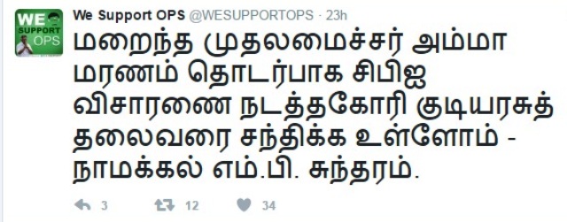 ஜெ.ஜெயலலிதா மரணம் தொடர்பாக சி.பி.ஐ. விசாரணைக்கோரி நாளை (28.02.2017) குடியரசுத்தலைவரை சந்திக்க, ஓ.பன்னீர் செல்வம் ஆதரவு அதிமுக எம்.பி.க்கள் முடிவு செய்துள்ளதாக அதிகாரப்பூர்வத் தகவல் தற்போது வெளியாகியுள்ளது.