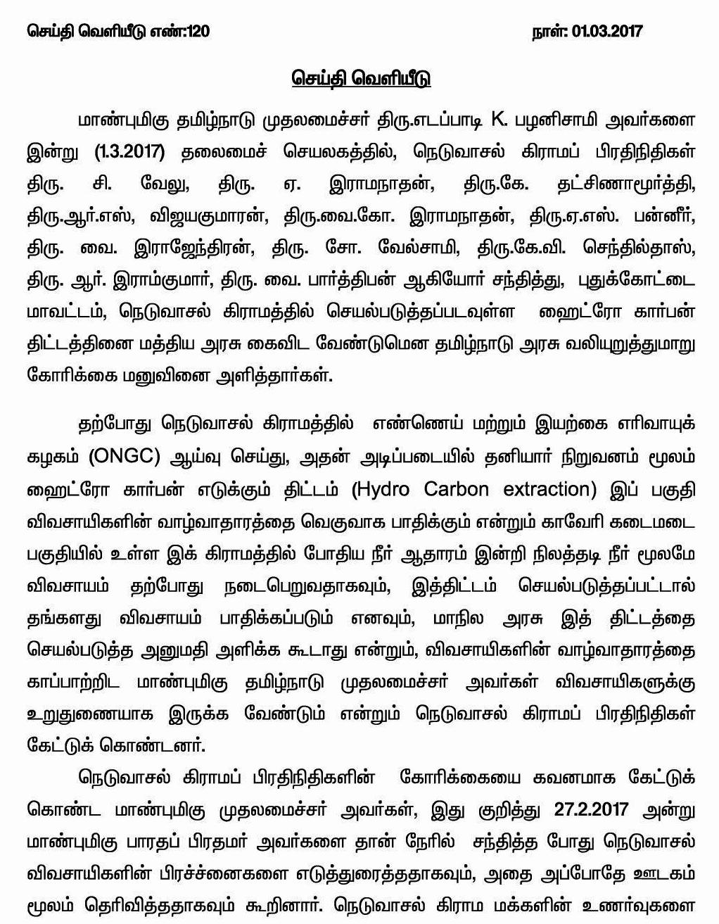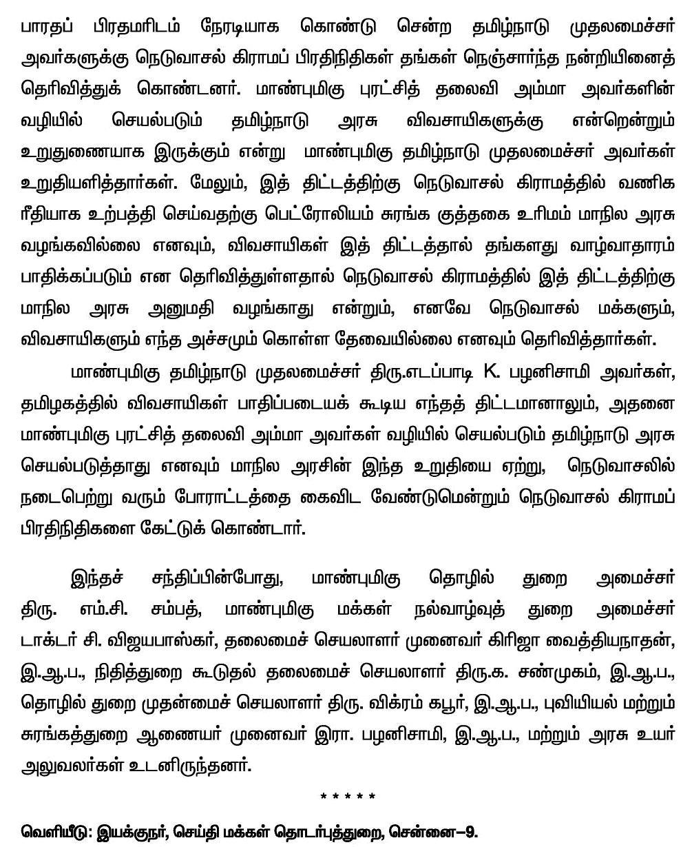 தமிழகத்தில் விவசாயிகள் பாதிப்படையக் கூடிய எந்தத் திட்டமானாலும், அதனை தமிழ்நாடு அரசு செயல்படுத்தாது: நெடுவாசல் கிராமப் பிரதிநிதிகளிடம் முதலமைச்சர் பழனிசாமி உறுதி.