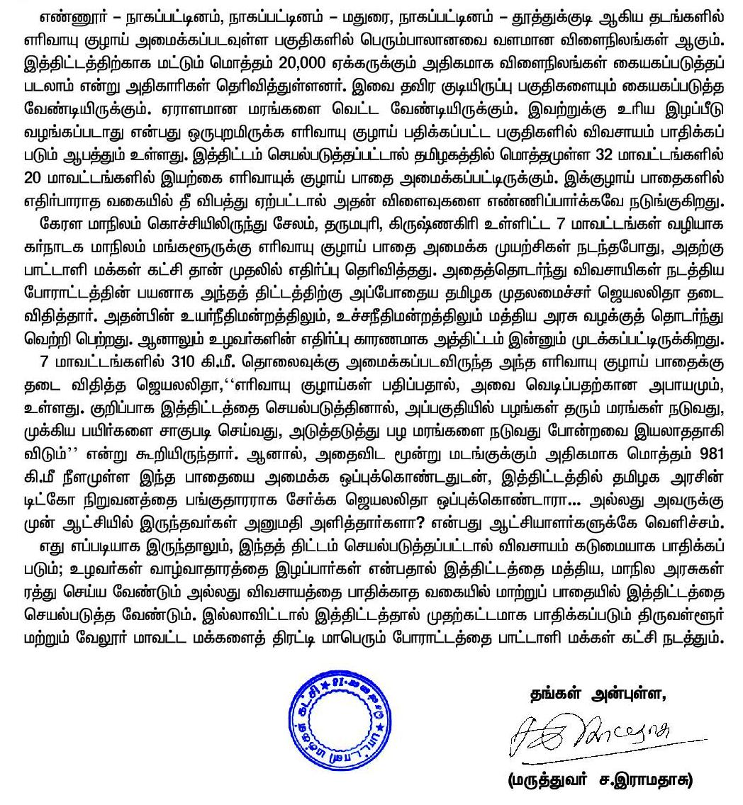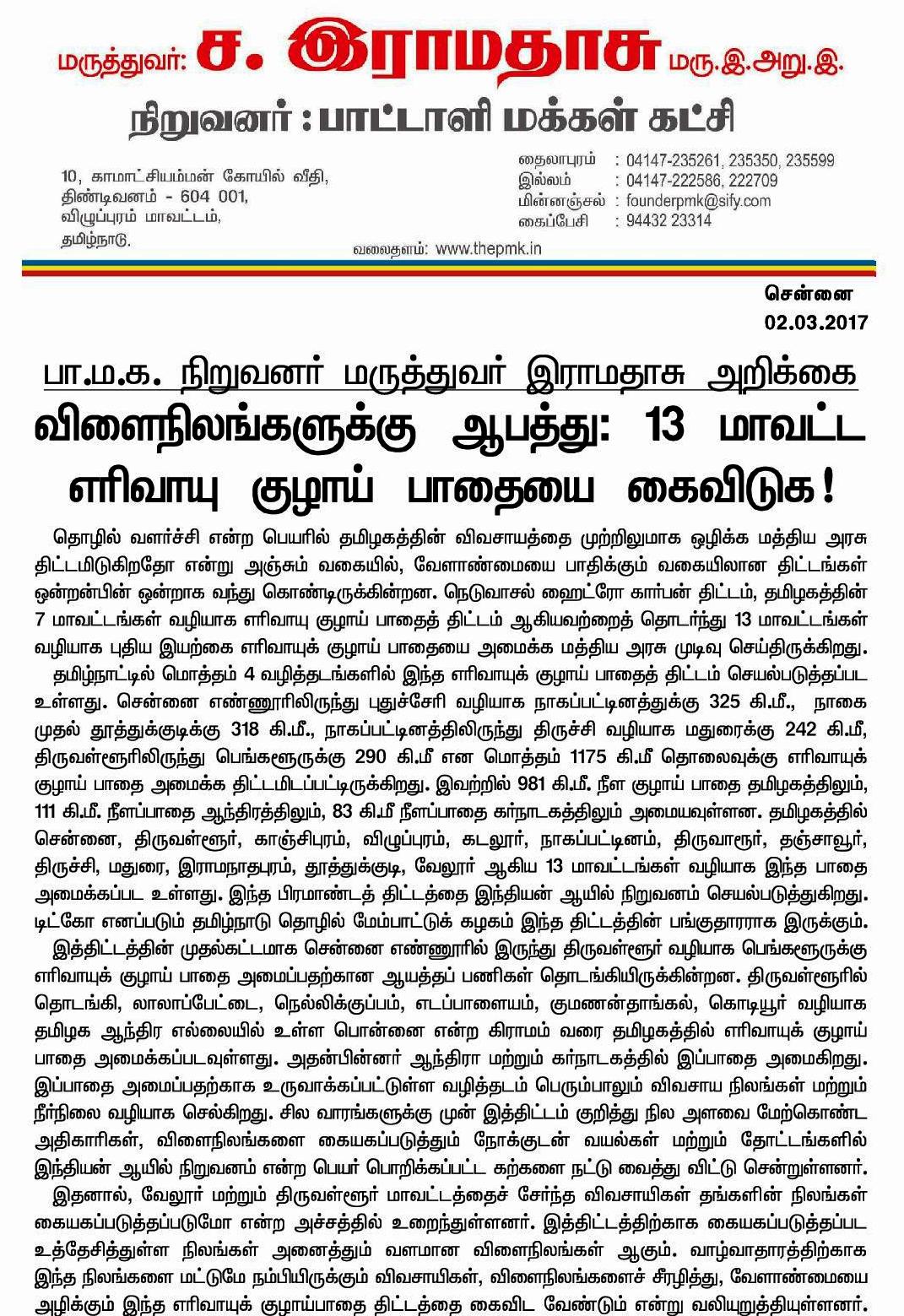 விளைநிலங்களுக்கு ஆபத்து; 13 மாவட்டங்கள் வழியாக புதிய இயற்கை எரிவாயுக் குழாய் அமைக்க மத்திய அரசு முடிவு: பா.ம.க. நிறுவனர் மருத்துவர் இராமதாஸ் அதிர்ச்சி தகவல்.