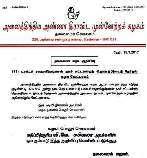Home|News|ஆர்.கே.நகர் இடைத்தேர்தலில் அதிமுக சார்பில் டி.டி.வி. தினகரன் போட்டி!- அதிகாரப்பூர்வ அறிவிப்பின் உண்மை நகல். -ஆர்.மார்ஷல்.