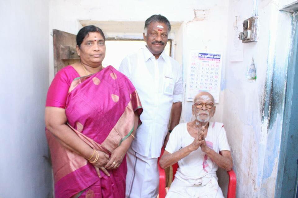இந்நிலையில், தேனி மாவட்டம், பெரியகுளத்தில் வசிக்கும் ஸ்ரீதியாகராஜ பண்டிதரின் 104-வது பிறந்த நாளை முன்னிட்டு அவரது வீட்டிற்கு ஓ.பன்னீர்செல்வம் தனது மனைவியுடன் நேரில் சென்று அவரிடம் ஆசீர் பெற்றார்.