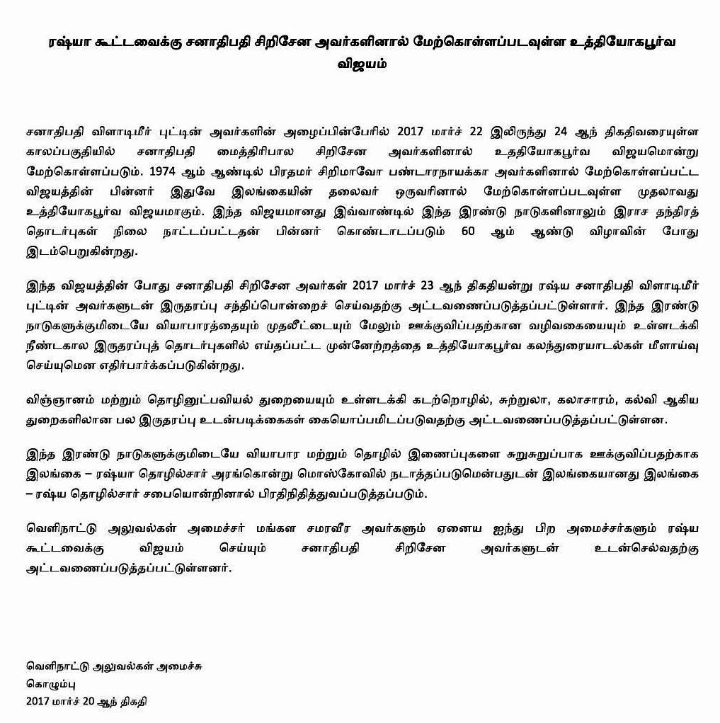 43 ஆண்டுகளுக்கு பின்னர் இது இலங்கை அரச தலைவரொருக்கு ரஷ்யாவுக்கான உத்தியோகபூர்வ விஜயத்துக்கான அழைப்பு விடுக்கப்பட்ட முதலாவது சந்தர்ப்பமாகும். ரஷ்ய ஜனாதிபதி விளாடிமிர் புடின் அழைப்பு விடுக்கப்பட்டது சிறப்பம்சமாகும். இலங்கை ஜனாதிபதியை உயர் கௌரவத்துடன் வரவேற்க ரஷ்யா தயாராக உள்ளது.