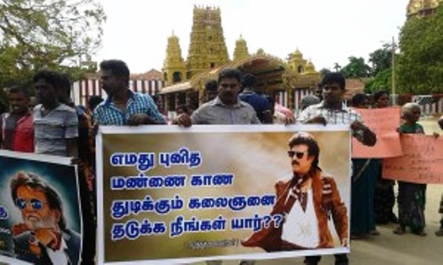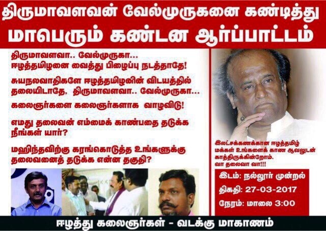 நடிகர் ரஜினிகாந்தின் ஈழத்து விஜயம் ரத்தாவதற்கு காரணமாக அமைந்த விடுதலை சிறுத்தைகள் கட்சியின் தலைவர் தொல். திருமாவளவன் மற்றும் தமிழக வாழ்வுரிமை கட்சியின் தலைவர் வேல்முருகன் உள்ளிட்டோருக்கு எதிராக யாழ்ப்பாணத்திலும் முல்லைத்தீவிலும் இன்று ஆர்ப்பாட்டம் நடைப்பெற்றது.