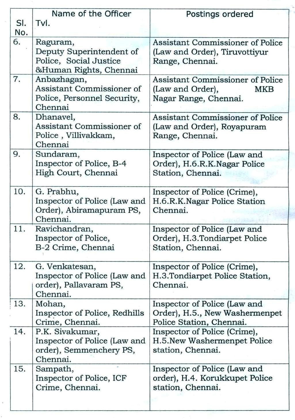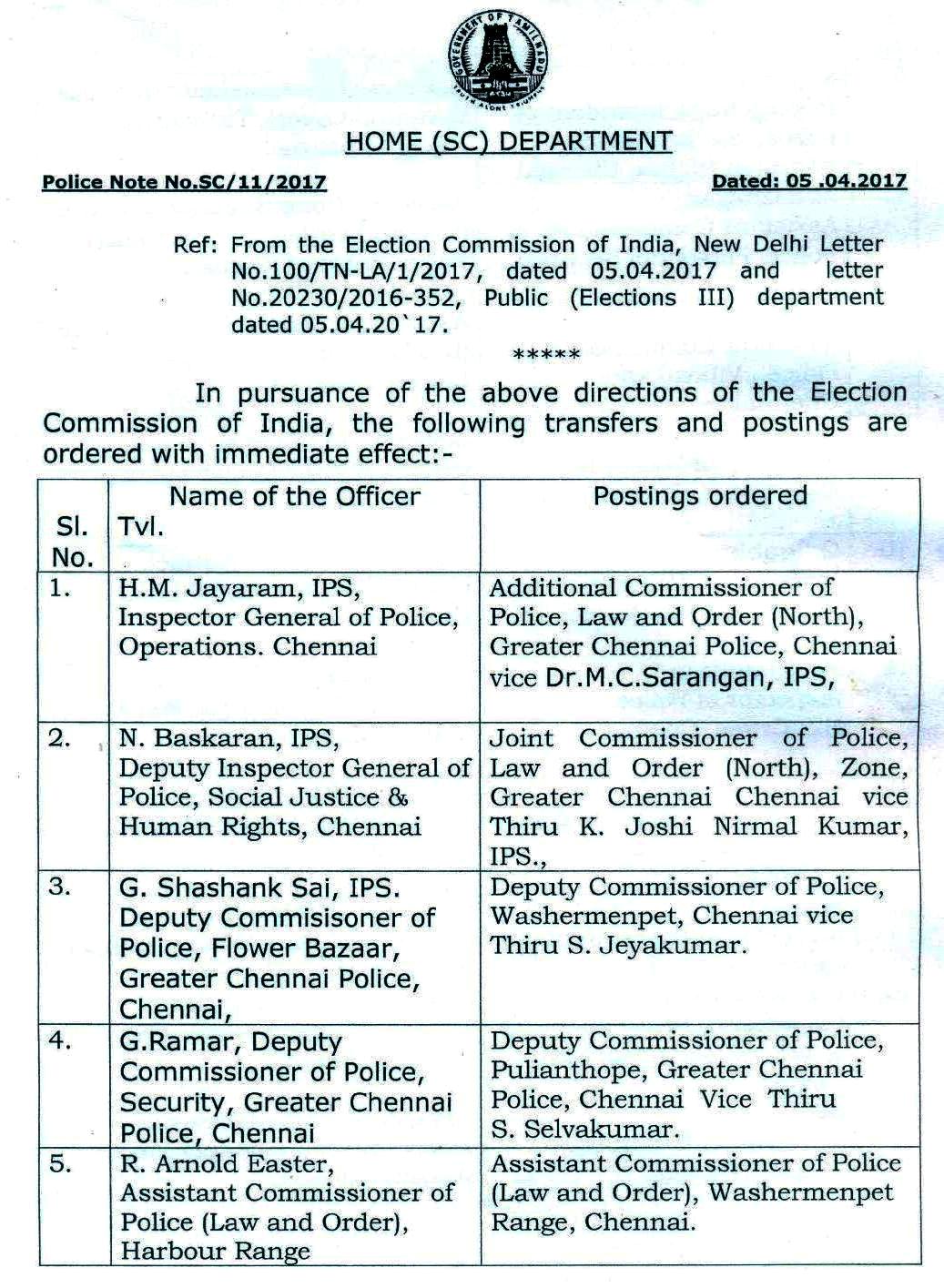 ஆர்.கே.நகர் இடைத் தேர்தலையொட்டி, சென்னை பெருநகர காவல்துறை ஆணையராக இருந்த எஸ்.ஜார்ஜ் இரு வாரங்களுக்கு முன் பணியிட மாற்றம் செய்யப்பட்டார். இதன் பின்னர் இரு தினங்களுக்கு முன் 4 உதவி ஆணையர்கள் பணியிட மாற்றம் செய்யப்பட்டனர்.