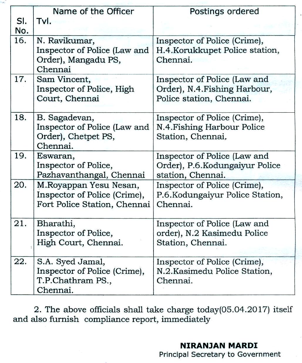 இந்நிலையில் தேர்தல் ஆணையத்தின் உத்தரவின் பேரில் மேலும் 22 காவல்துறை அதிகாரிகளைப் பணியிட மாற்றம் செய்து தமிழக உள்துறை முதன்மைச் செயலர் நிரஞ்சன்மார்டி உத்தரவிட்டுள்ளார்.