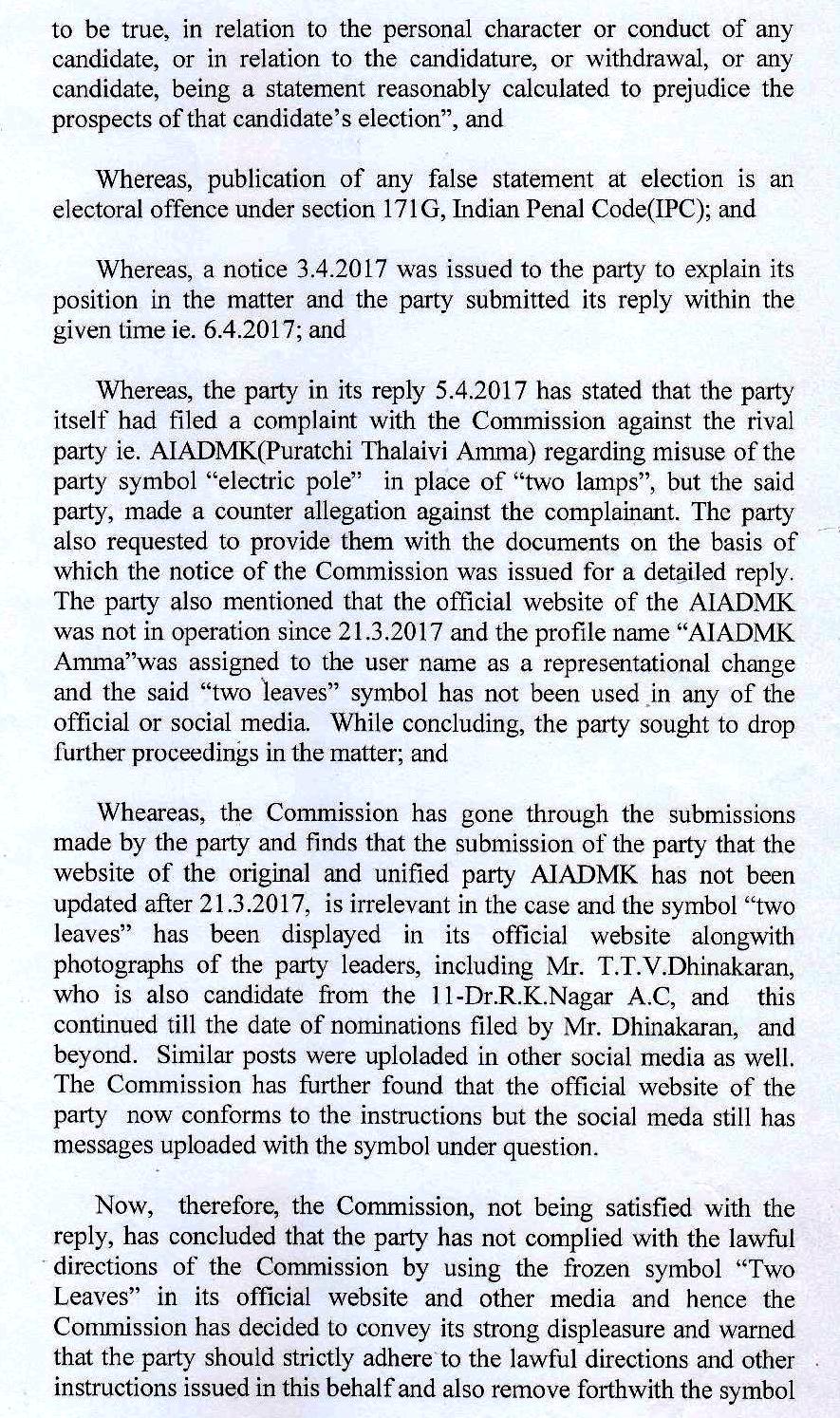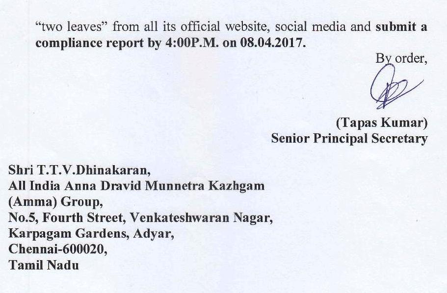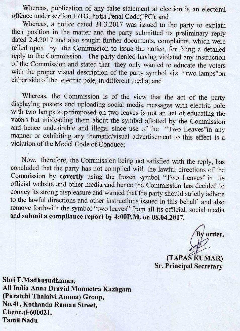 சின்னத்தை தவறாக பயன்படுத்திய புகாரில் அதிமுக (புரட்சிதலைவி அம்மா) அணியின் மதுசூதனுக்கும், அதிமுக பெயரை பயன்படுத்திய புகாரில் அதிமுக(அம்மா) அணியின் டி.டி.வி.தினகரனுக்கும் இன்று (07.04.2017) இந்திய தேர்தல் ஆணையம் நோட்டீஸ் அனுப்பியுள்ளது.