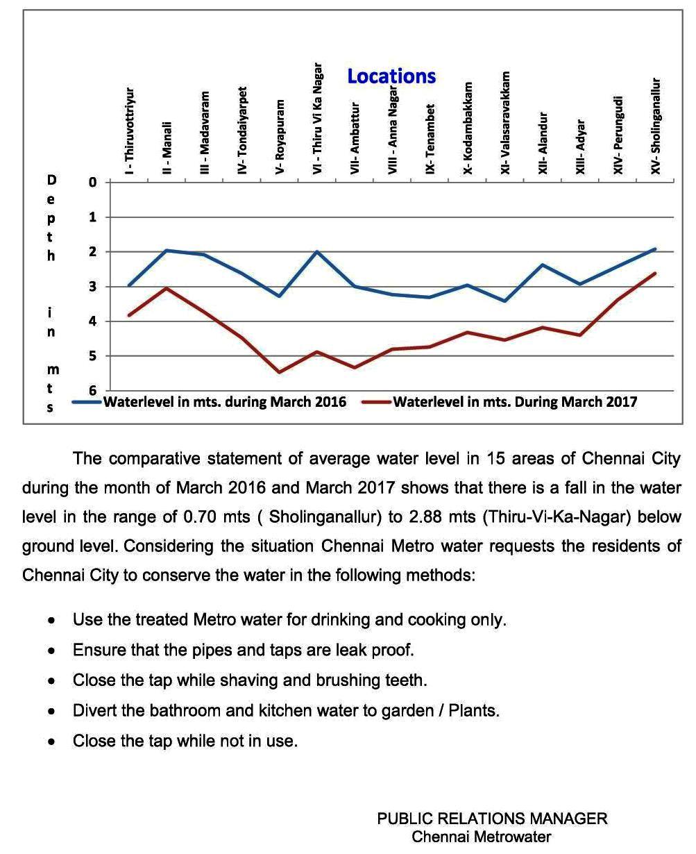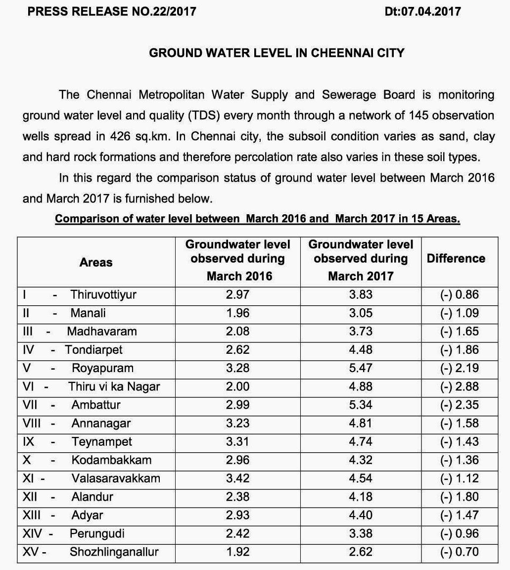 குறிப்பாக தலைநகர் சென்னையில் கடந்த (மார்ச்-2016) ஆண்டை விட, இந்த ஆண்டு (மார்ச்-2017) நிலத்தடி நீர் மட்டம் பெருமளவில் குறைந்து விட்டதாக, சென்னை பெருநகர் குடிநீர் வழங்கல் மற்றும் கழிவுநீர் அகற்று வாரியம் (Chennai Metropolitan Water Supply and Sewerage Board) வெளியிட்டுள்ள ஆய்வறிக்கை அதிர்ச்சியளிப்பதாக உள்ளது.