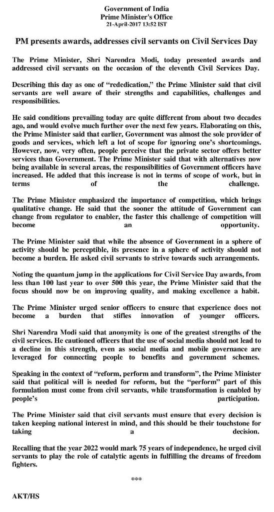 பிரதமர் நரேந்திர மோதி இன்று 11 – வது சிவில் சர்வீசஸ் தினத்தையொட்டி அரசு ஊழியர்களுக்கு விருது வழங்கினார்.