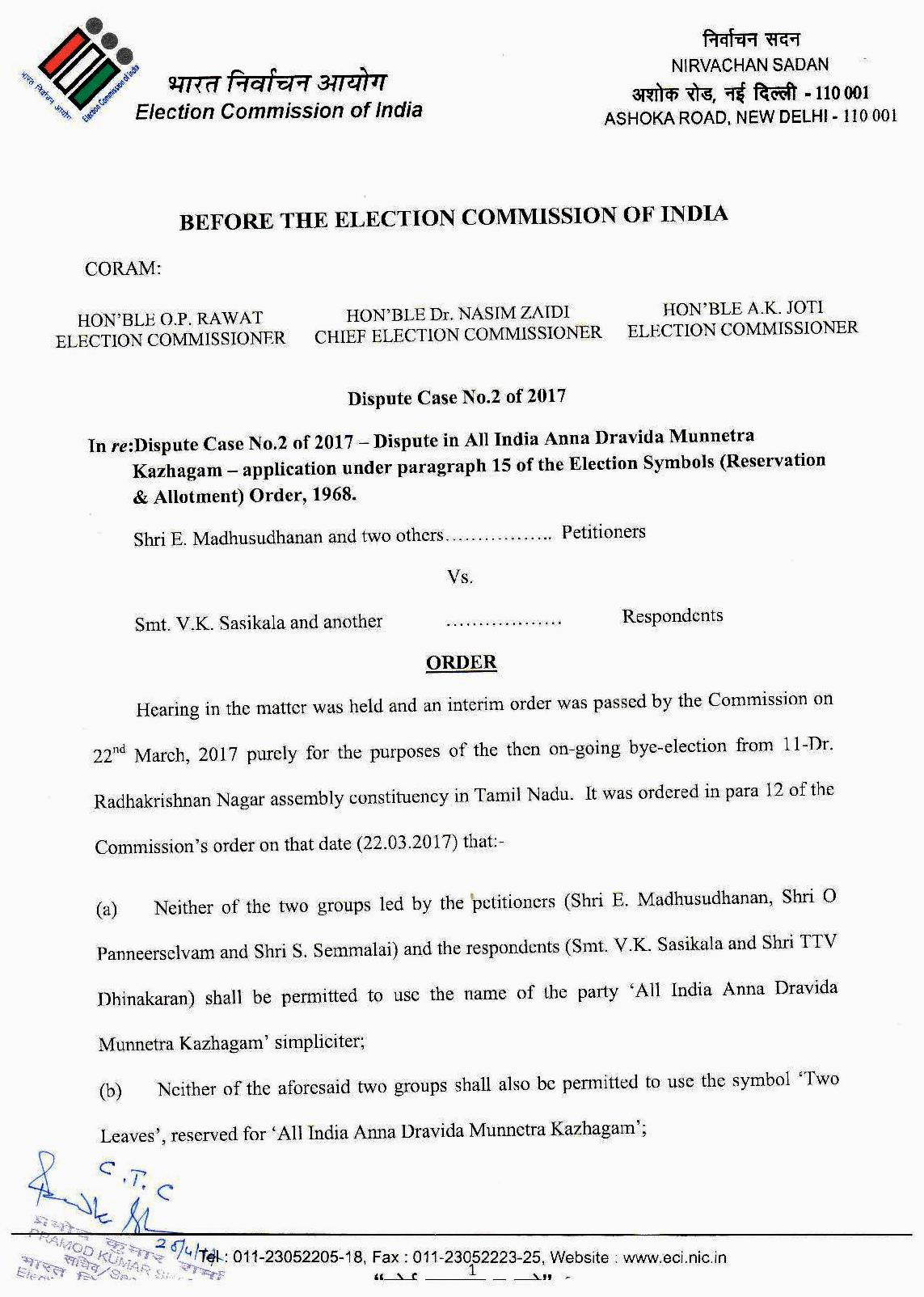ஜெ.ஜெயலலிதாவின் மரணத்தை தொடர்ந்து .தி.மு.. இரண்டாக உடைந்தது. ஆர்.கே.நகர் தொகுதி இடைத்தேர்தலில் .தி.மு..வின் இரட்டை இலை சின்னத்தை தங்களுக்கே ஒதுக்கவேண்டும் என்று .பன்னீர்செல்வம் அணியினரும், சசிகலா அணியினரும் இந்திய தேர்தல் ஆணையத்திடம் கோரிக்கை விடுத்தனர்இதற்காக தங்கள் தரப்பிலான ஆவணங்களையும் அவர்கள் தாக்கல் செய்தனர்.