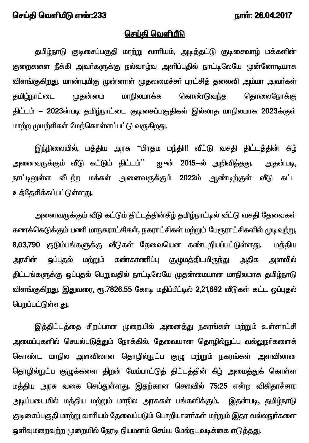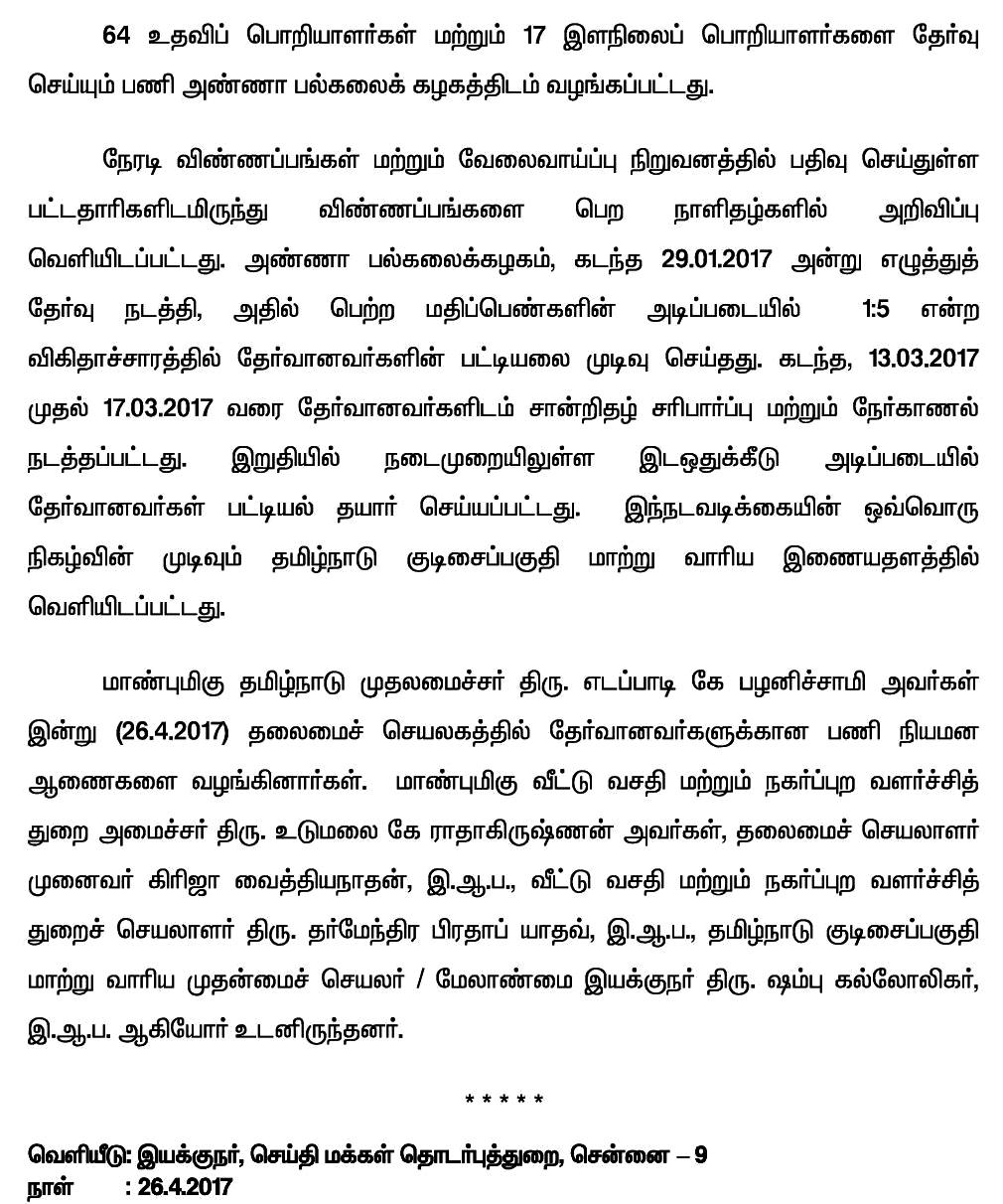 தமிழ்நாடு குடிசை மாற்று வாரியத்தில் தேர்வான உதவிப் பொறியாளர்கள் மற்றும் இளநிலைப் பொறியாளர்களுக்கான பணி நியமன ஆணைகளை தமிழ்நாடு முதலமைச்சர் கே.பழனிச்சாமி வழங்கினார்.