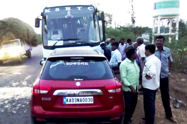பெங்களூரில் இருந்து மேல்மருவத்தூருக்கு மஞ்சுநாதன் (வயது57), அவரது மகன் சஞ்சய்(வயது 16), உறவினர் பன்னீர்செல்வம்(வயது 48) காரில் வந்துள்ளனர். காரை டிரைவர் ரகு (வயது28) ஓட்டியுள்ளார். இன்று விடியற்காலை 3 மணியளவில் செங்கம்-பெங்களூர் செல்லும் சாலை கருமாங்குளம் அருகே கார் வந்தபோது ஓட்டுநர் ரகுவின் கட்டுப்பாட்டை இழந்து கார் கர்நாடக அரசு பஸ் மீது மோதியது.