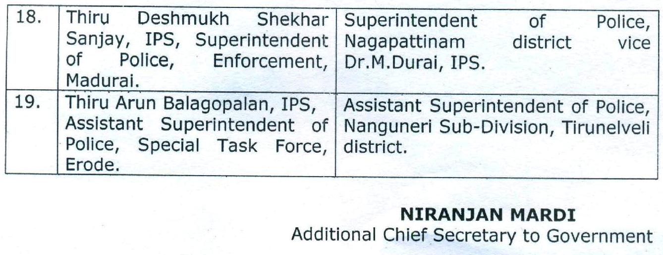 தமிழகத்தில் 19 ஐ.பி.எஸ்அதிகாரிகளைபணியிடமாற்றம்செய்துதமிழகஅரசுஉத்தரவுபிறப்பித்துள்ளது. இதற்கான உத்தரவைஉள்துறை கூடுதல் முதன்மைசெயலாளர்நிரஞ்சன்மார்டிபிறப்பித்துள்ளார்.