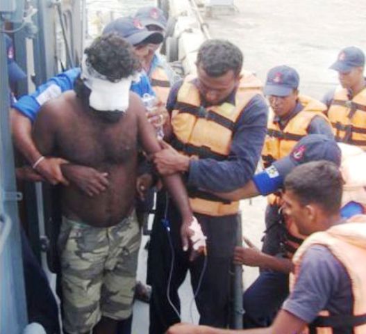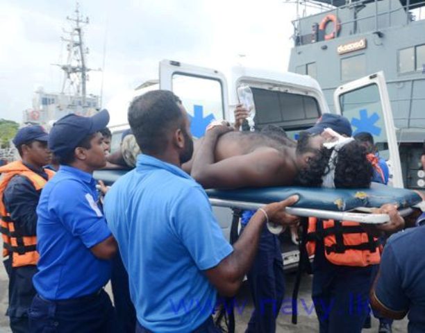 இந்நிலையில் இலங்கை கடலோரப் பாதுகாப்பு படையினருக்கு தகவல் தெரிவித்துள்ளனர். இலங்கை தென்பிராந்திய கட்டளையகம் அளித்த உத்தரவின்படி இலங்கை கடற்படைக்கு சொந்தமான அதிவிரைவு படகின் மூலம் சுமார் 62 கடல் மைல்கள் தூரத்தில் இருந்து காலி துறைமுகத்திற்கு பாதிக்கப்பட்ட மீனவரை கொண்டுவந்தனர்.
