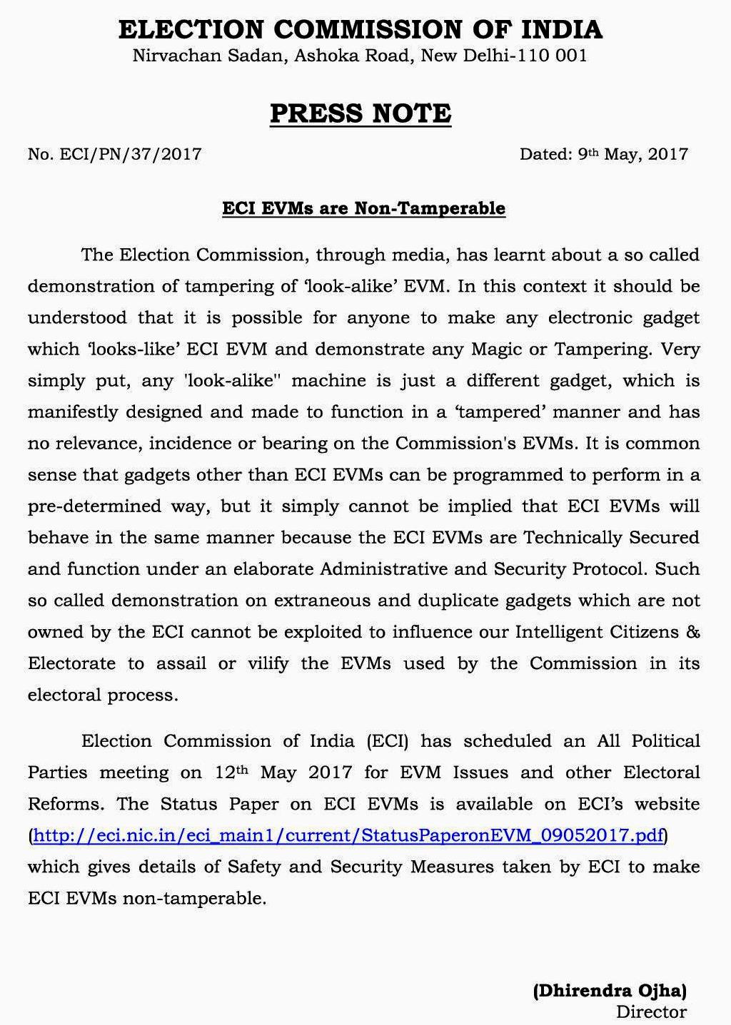 இந்நிலையில், மின்னணு ஓட்டு எந்திரங்கள் சர்ச்சை பற்றியும், தேர்தல் சீர்திருத்தங்கள் குறித்தும் அனைத்துக் கட்சிகளிடமும் விவாதிப்பதற்காக அனைத்துக் கட்சி கூட்டத்துக்கு இந்திய தேர்தல் ஆணையம் அழைப்பு விடுத்துள்ளது. இந்த கூட்டம் டெல்லியில் நாளை (மே-12 ந்தேதி) நடைப்பெற இருக்கிறது.