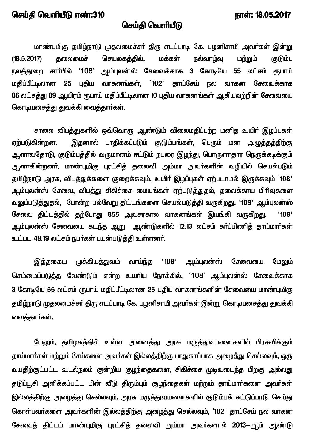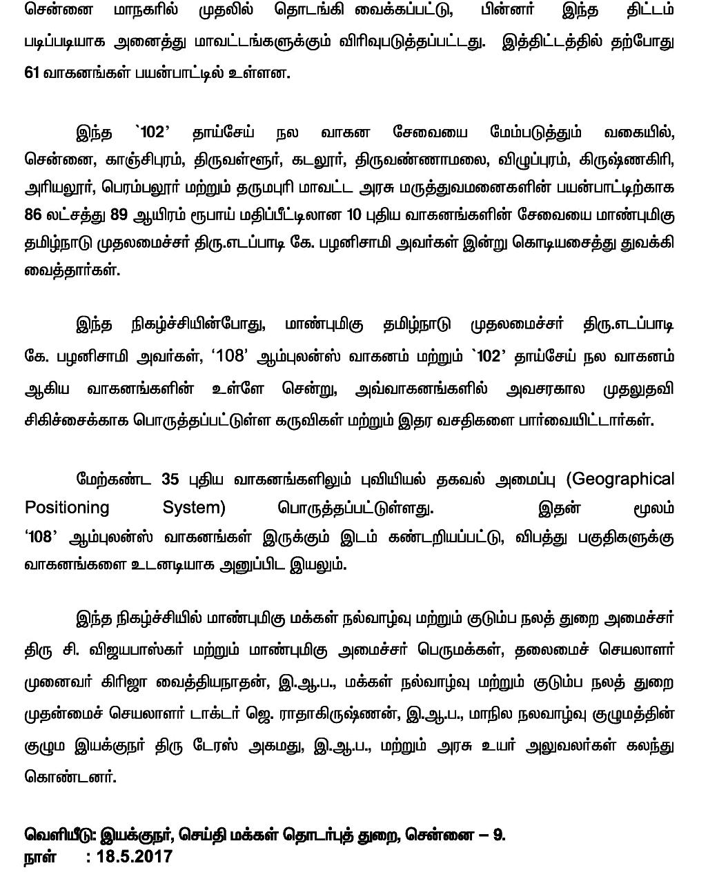 மக்கள் நல்வாழ்வு மற்றும் குடும்ப நலத்துறை சார்பில் ‘108’ ஆம்புலன்ஸ் மற்றும் ‘102’ தாய்சேய் நல சேவைக்காக, புதிய வாகனங்களை தமிழ்நாடு முதலமைச்சர் கே. பழனிசாமி துவக்கி வைத்தார்.