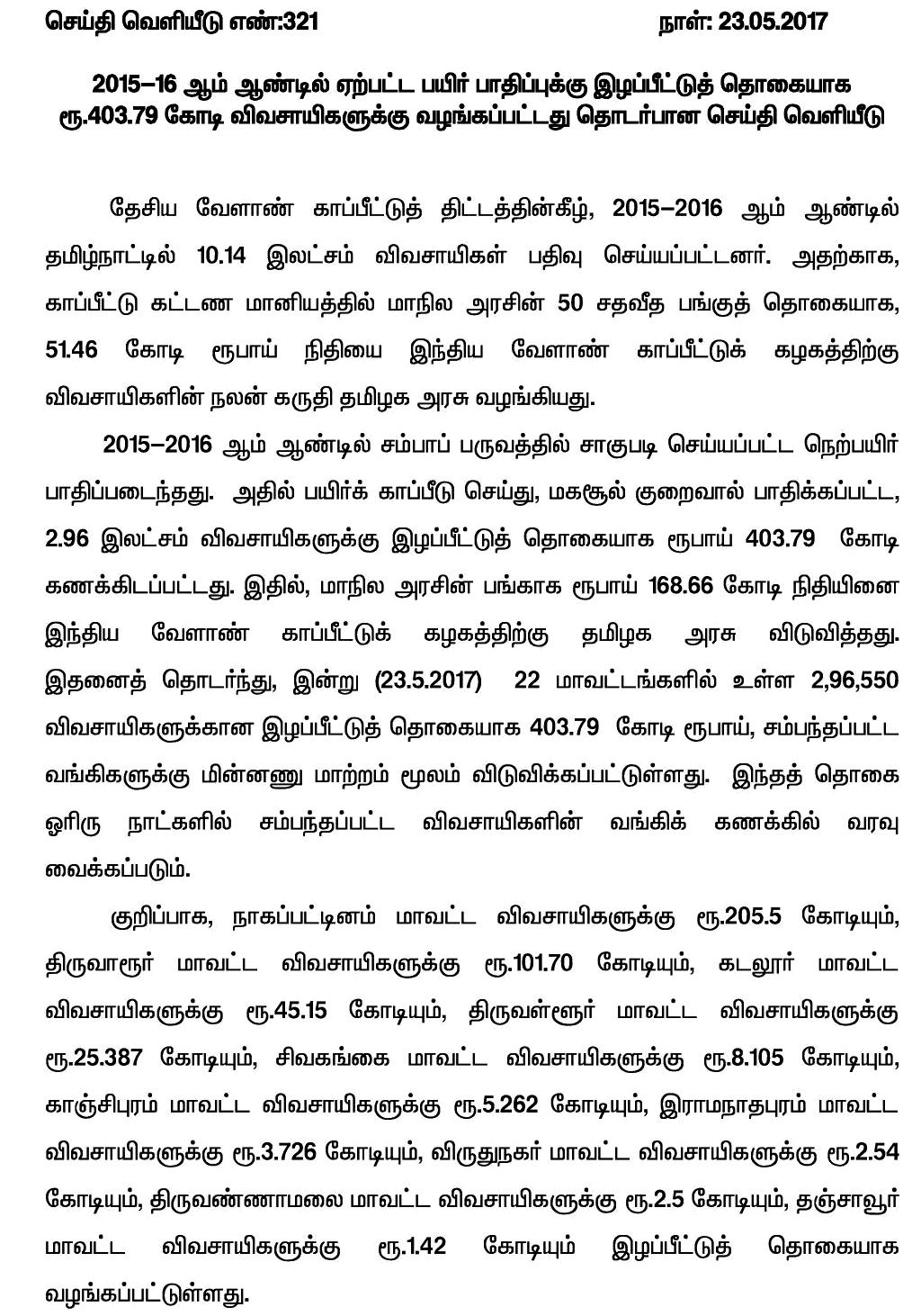 பயிர் பாதிப்புக்கு இழப்பீட்டுத் தொகையாக ரூ.403.79 கோடி விவசாயிகளுக்கு வழங்கப்பட்டது: தமிழக அரசு தகவல்.