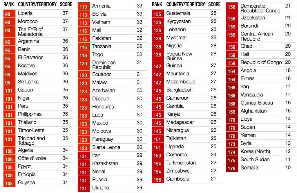 டிரான்பரன்சி இன்டர்நேஷனல் (Transparency International) எனும் சர்வதேச அமைப்பு, உலகில் அதிகம் ஊழல் மலிந்துள்ள நாடுகள் குறித்த கருத்துக்கணிப்பை வெளியிட்டுள்ளது.