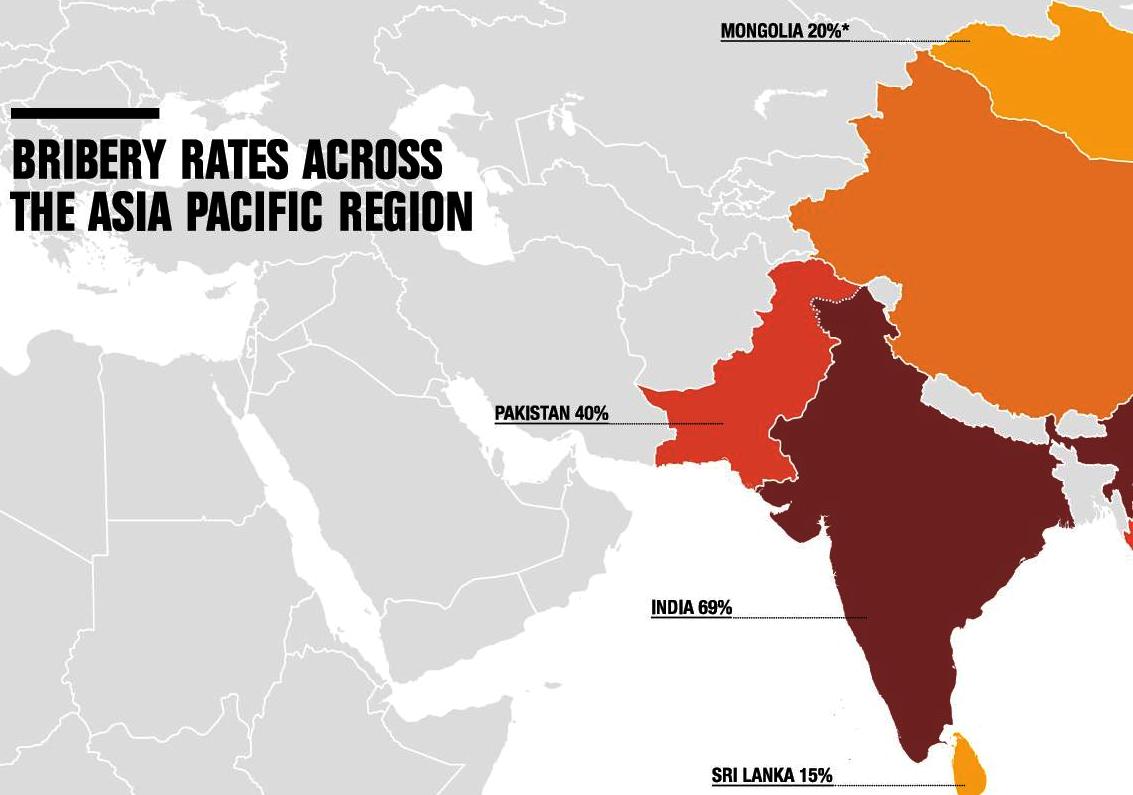 கல்வி, சுகாதாரம் உள்ளிட்ட மக்களின் அடிப்படை தேவைகள் பெற லஞ்சம் கொடுக்கப்பட்டதா? என்பதன் அடிப்படையிலான கருத்துக்கணிப்பின்படி, ஊழல் பட்டியலில் இந்தியா (69 சதவீதம்) முதலிடத்திலும், ஜப்பான் (0.2 சதவீதம்) கடைசி இடத்திலும் உள்ளது.